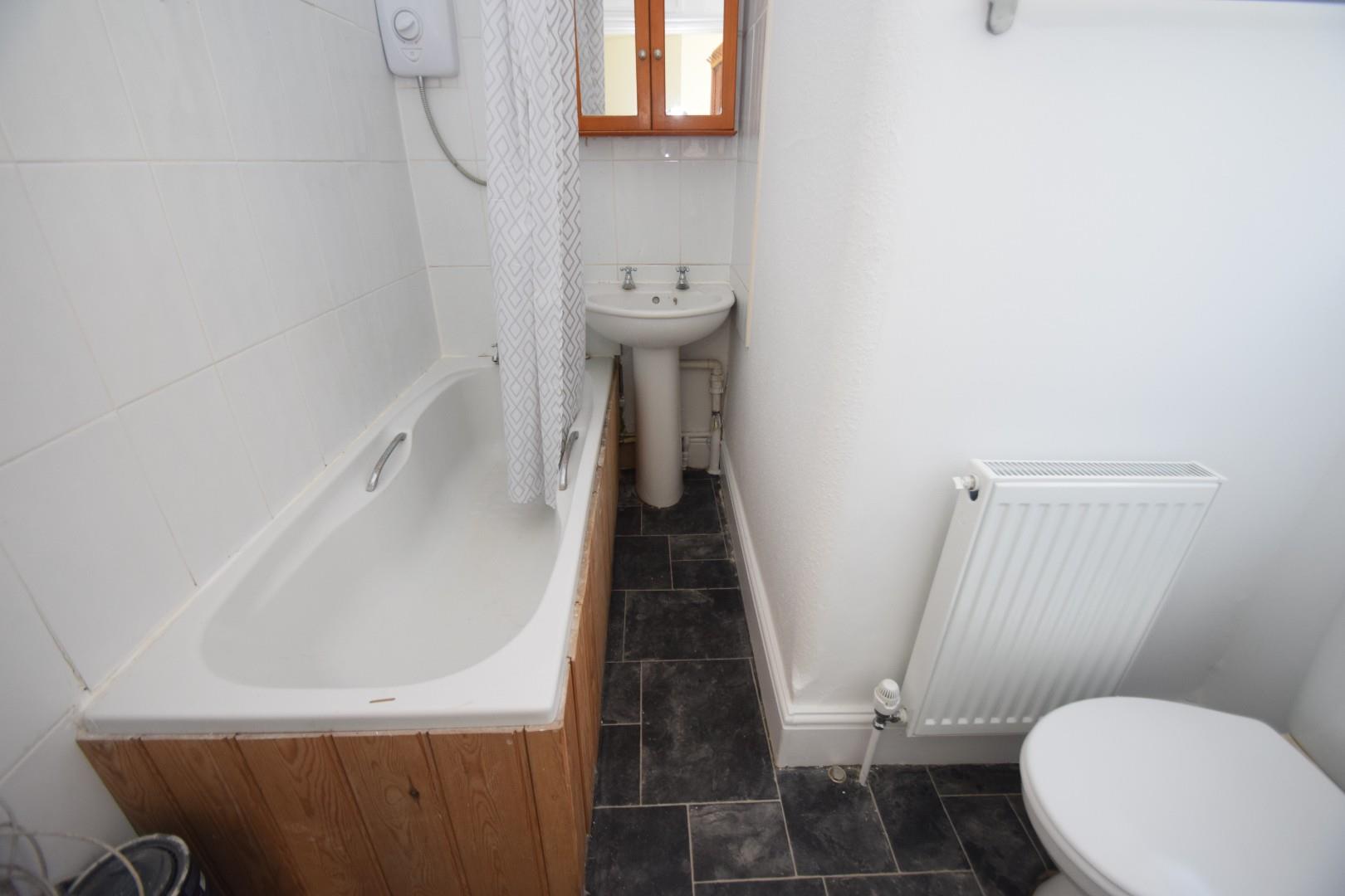 Bathroom - Suite comprising panelled bath with electric shower over, pedestal wash hand basin and low level WC. Radiator. Tiled splashback. Window to rear aspect.