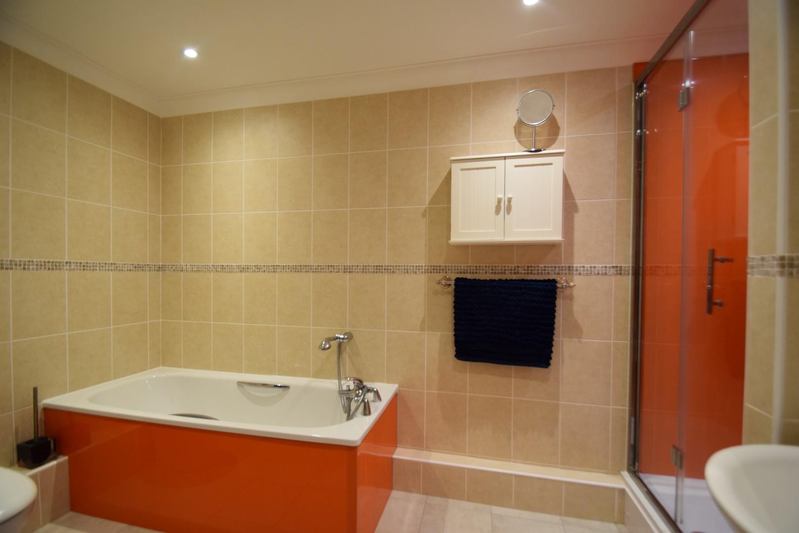 Fitted in a suite comprising panelled bath with shower attachment, low flush w.c., wash basin, shower cubicle, tiled walls, electric shaver point.