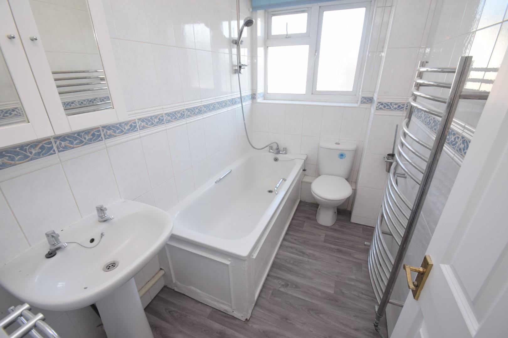 Bathroom - Fitted in a white suite comprising of a bath with mixer taps and shower attachment with riser rail, Wash hand basin, Low level W.C., Heated towel rail, Double glazed window to the rear aspect.
