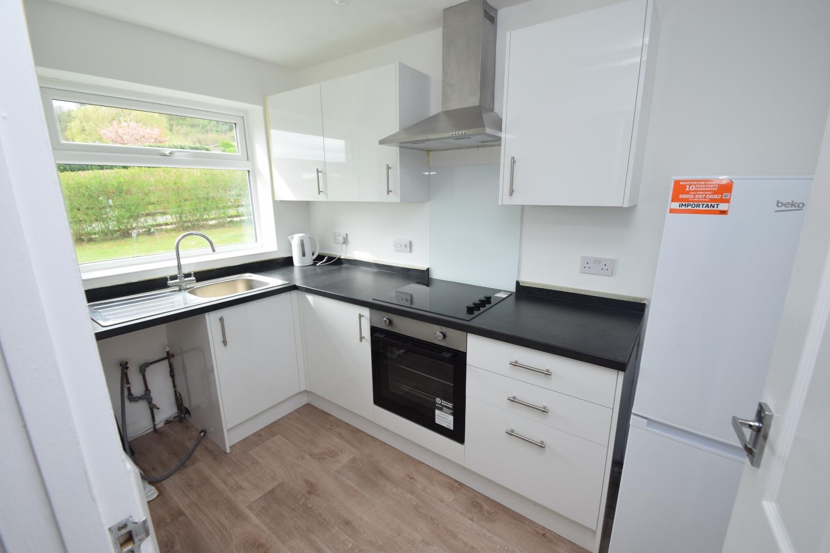 Newly installed in a range of wall and base mounted cupboards and drawers. Work tops with inset stainless steel sink and single drainer unit. Spaces for washing machine and fridge/freezer, double glazed window to rear.
