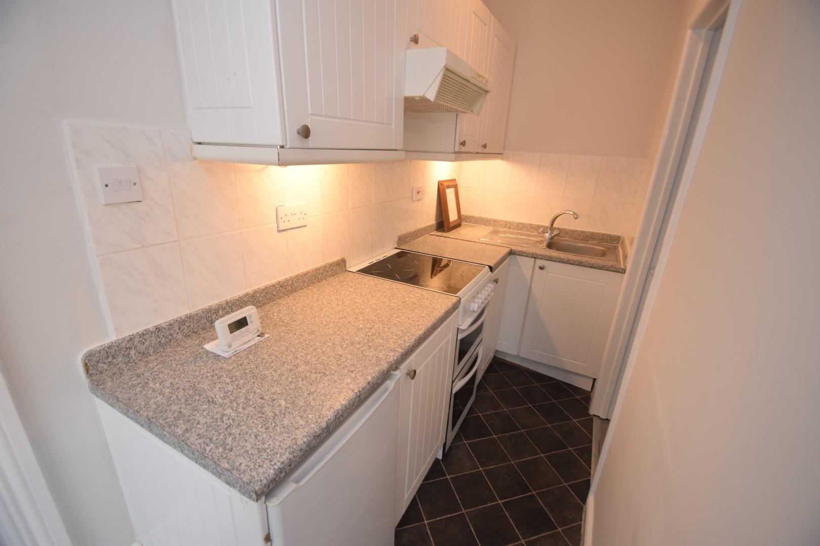 Fitted in a range of wall and base mounted cupboards and drawers. Work tops with inset stainless steel sink. Cooker and fridge.