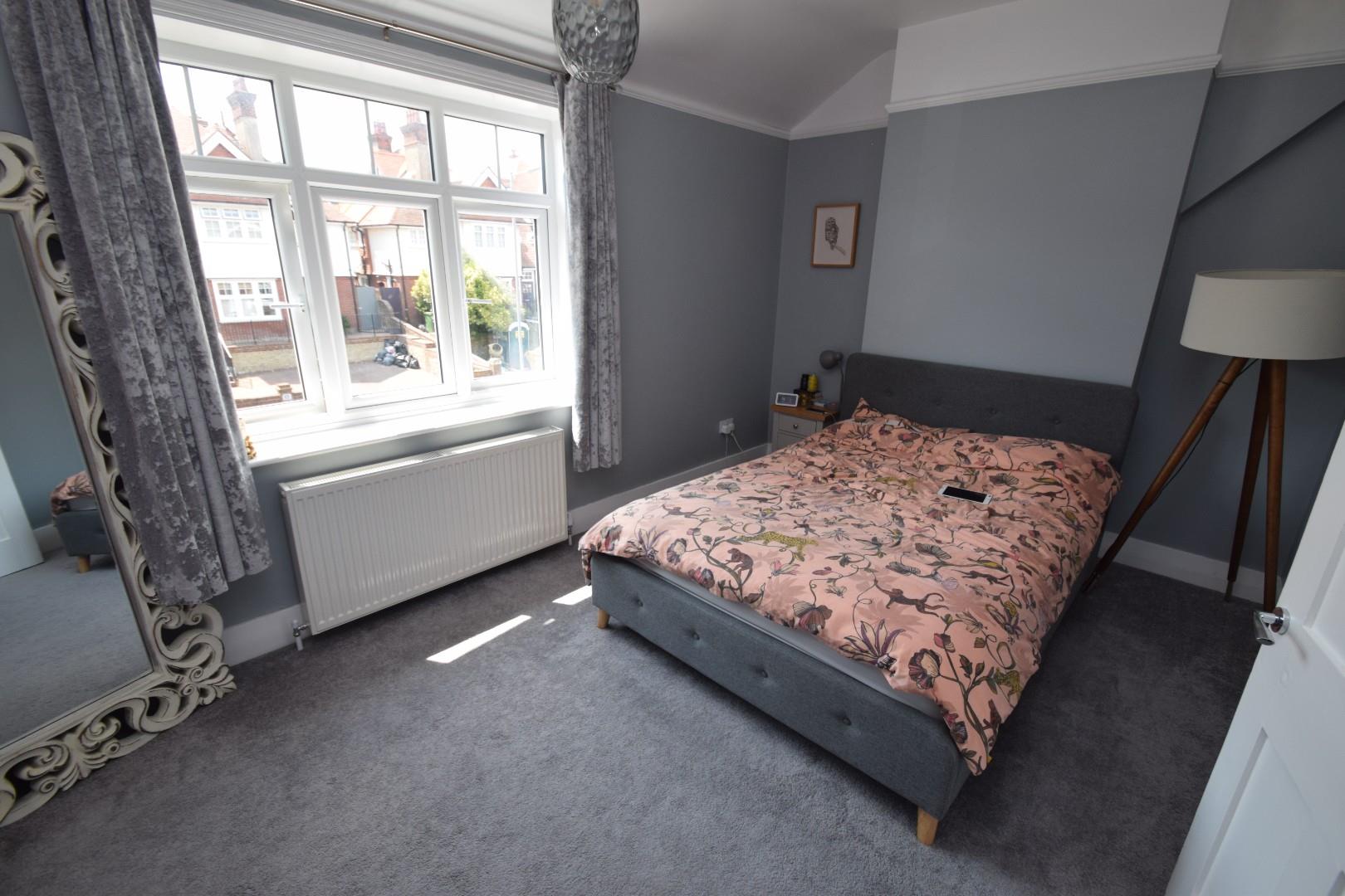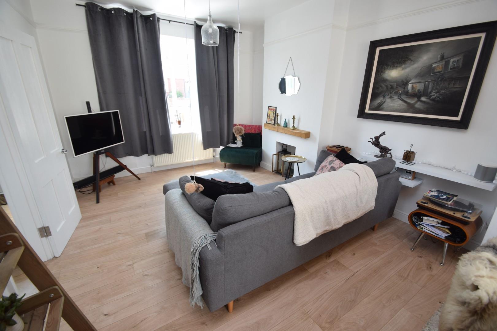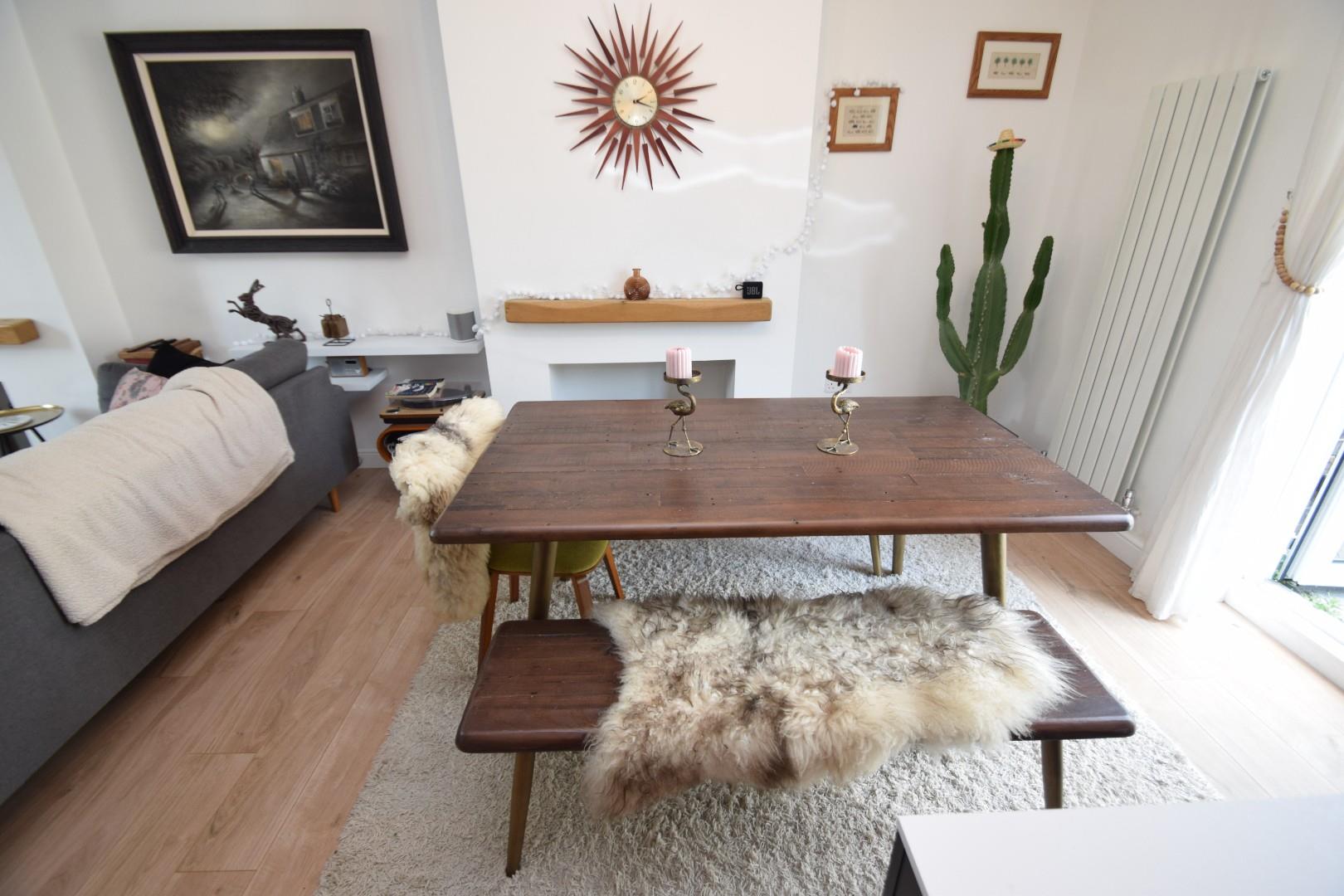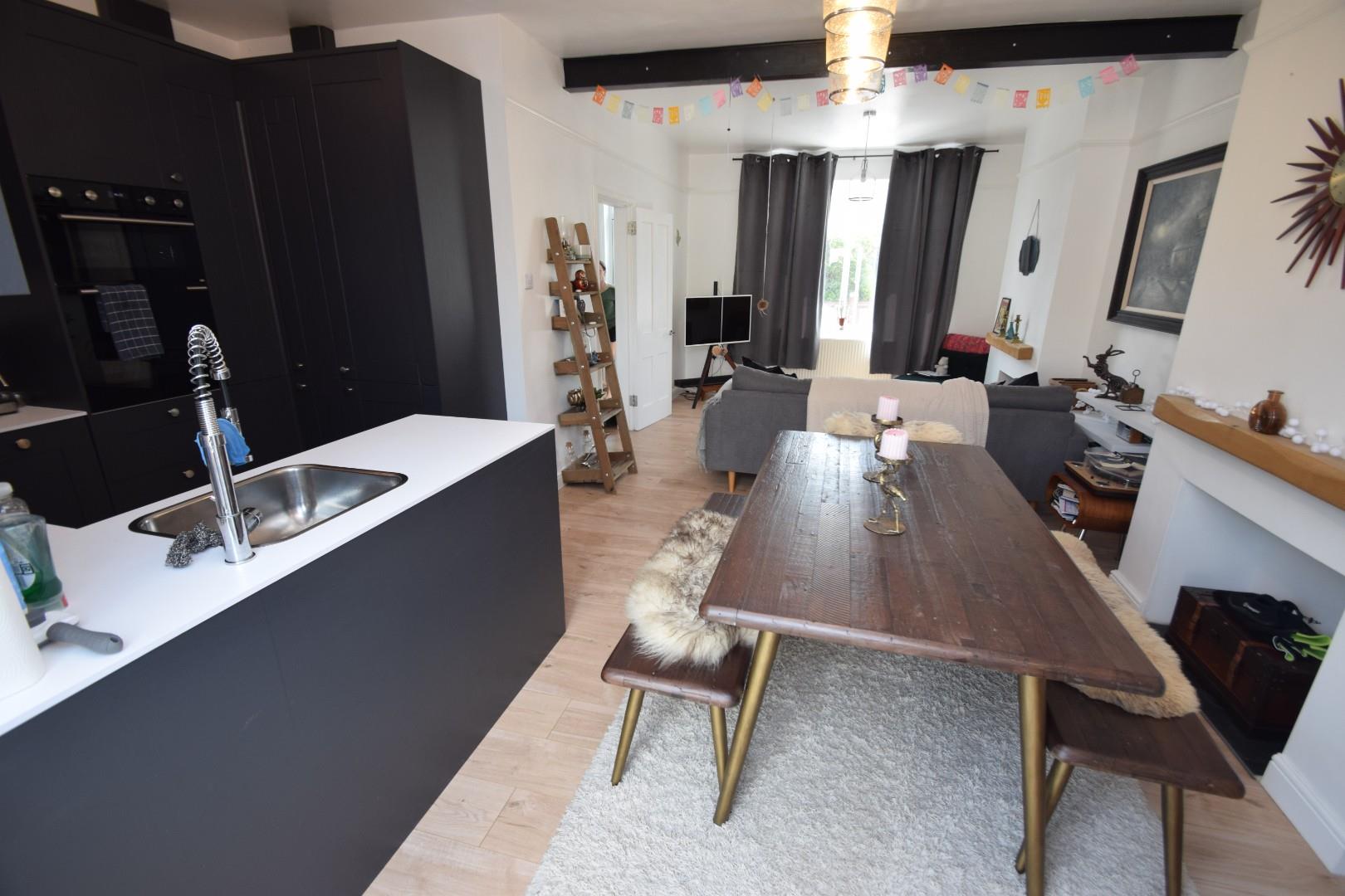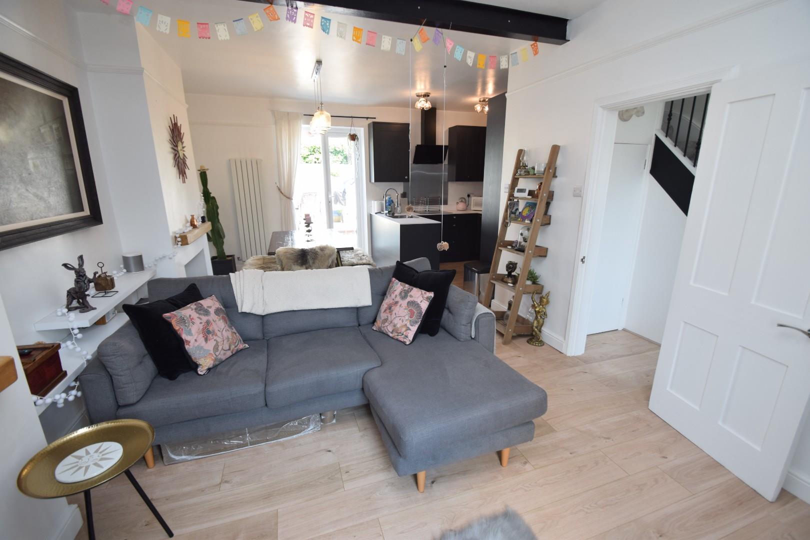 A through room with double glazed window to front and french doors leading to rear garden. Two ornamental fireplace recesses, radiators, open plan to: