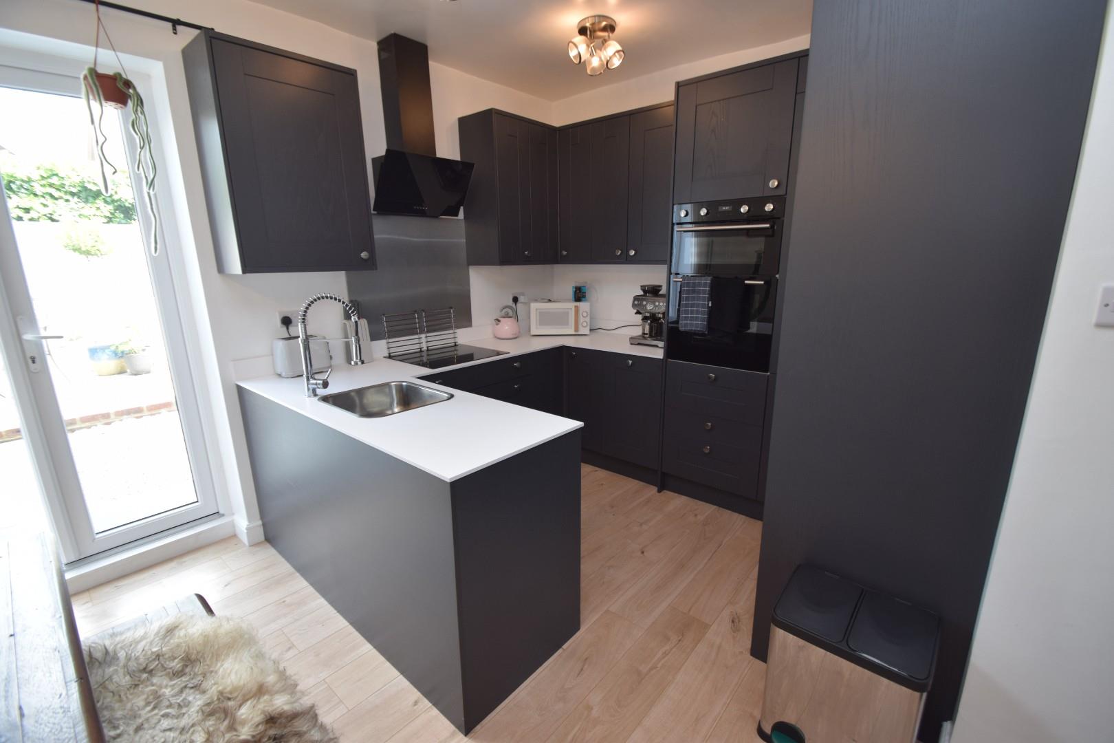 fitted in a range of modern eye and base level cupboards and drawers, inset sink. Built in eye level double oven and four ring induction hob with extractor hood above. Integrated dishwasher and washing machine. Integrated fridge and freezer.