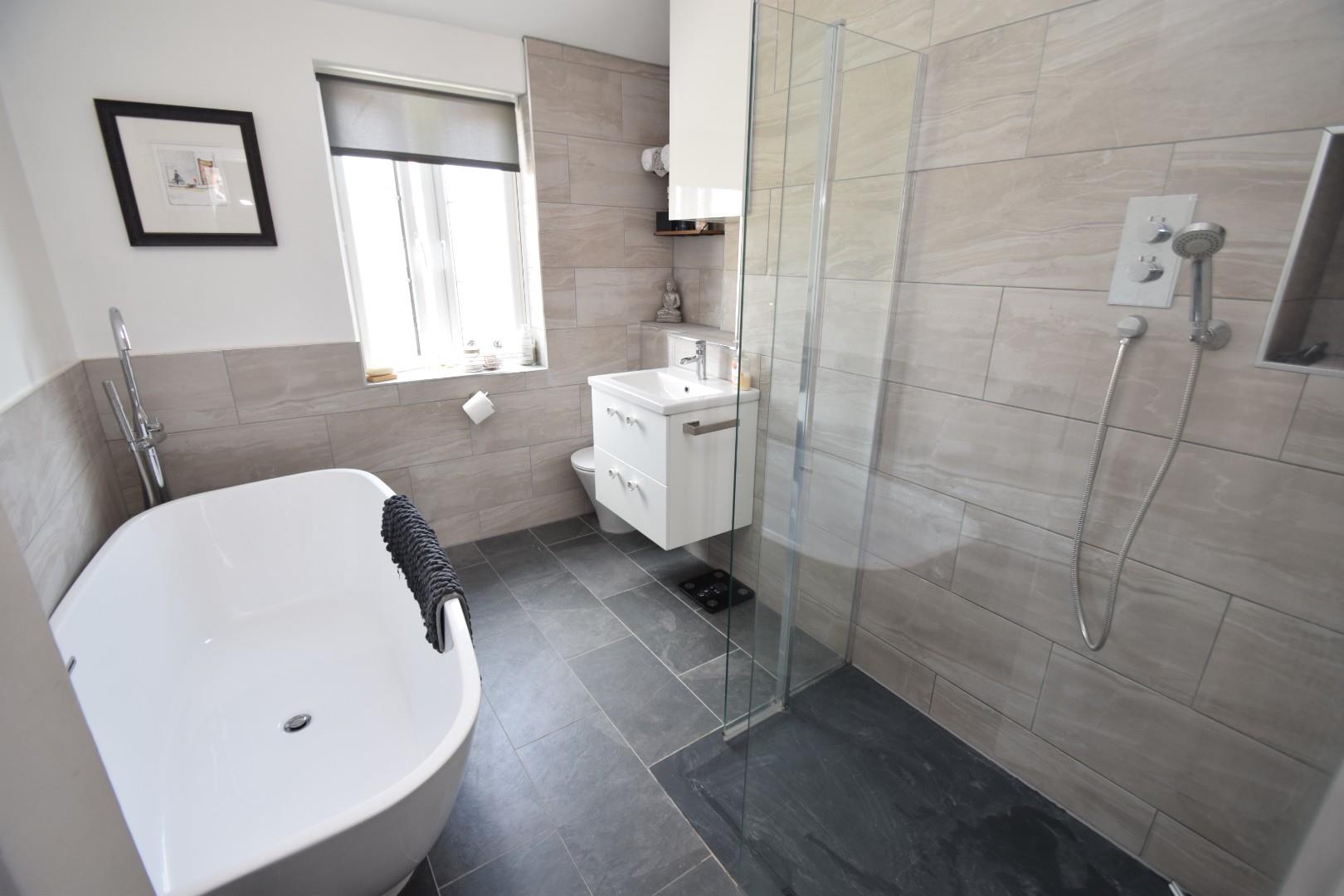 In a luxury suite comprising free standing bath, separate shower cubicle, vanity wash basin with drawers below, low level wc, tiled floor, radiator.