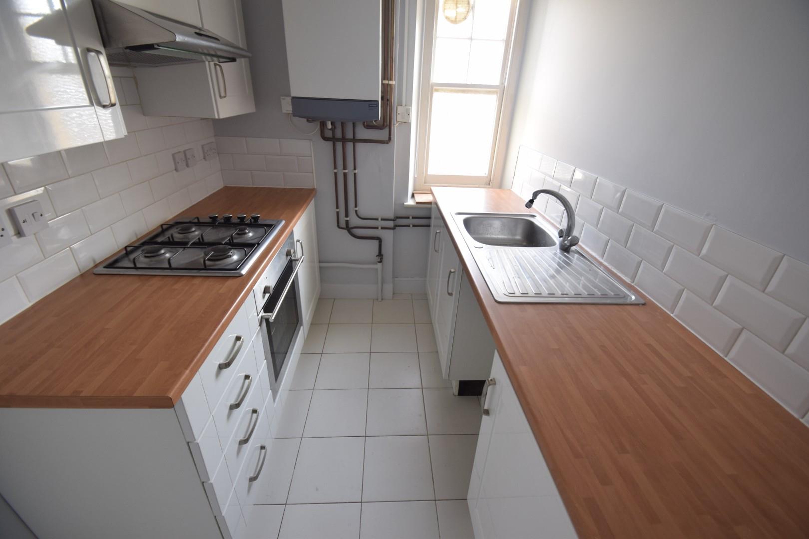 Fitted in a range of wall and base mounted cupboards and drawers. Work tops with inset stainless steel sink. Built in oven and 4 ring gas hob with extractor hood above. Spaces for washing machine and fridge/freezer, tiled floor, wall mounted gas fired boiler, window to side.