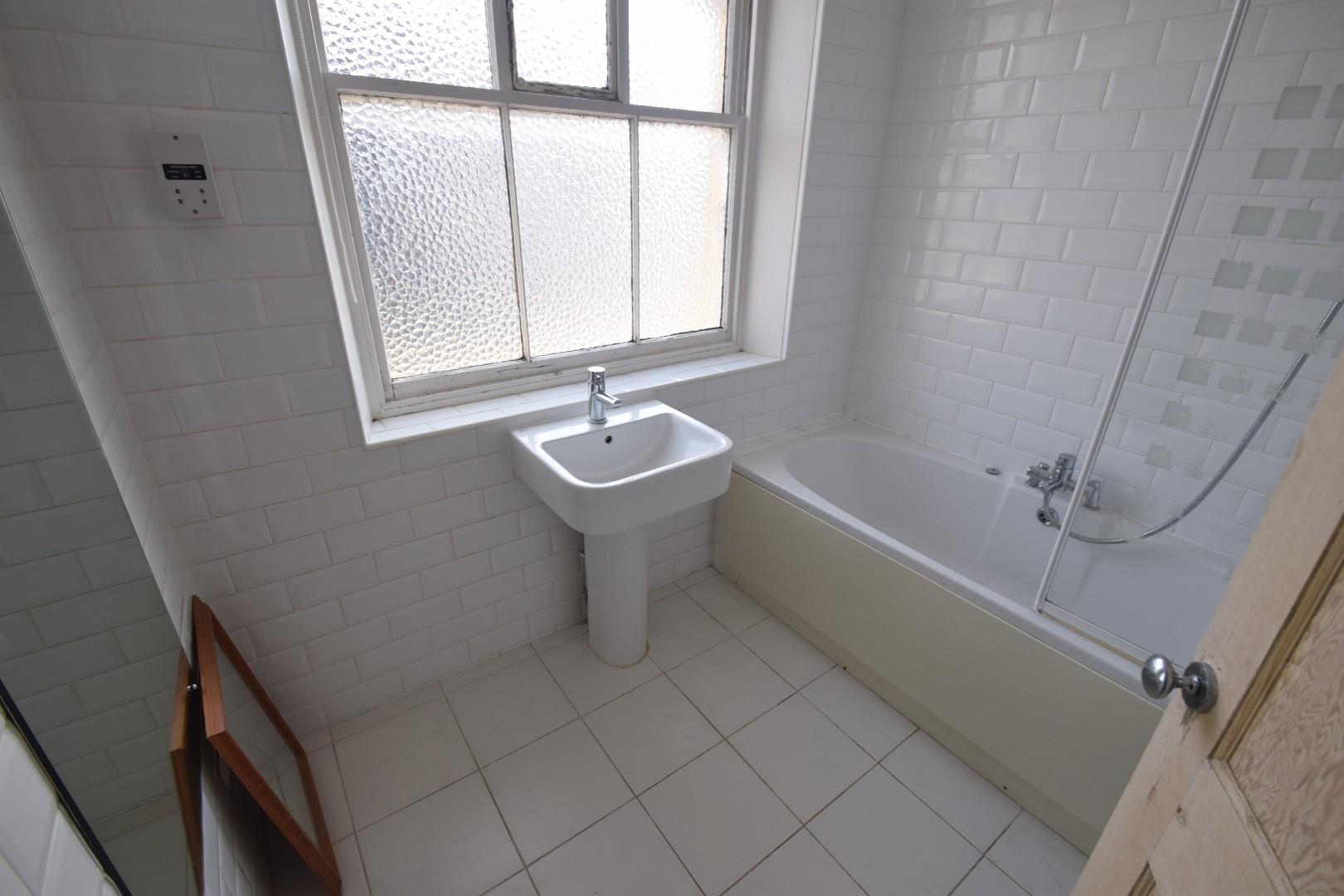 In a white suite comprising panelled bath with mixer tap and shower attachment, pedestal wash basin, tiled walls, heated chrome towel ladder, window to side.