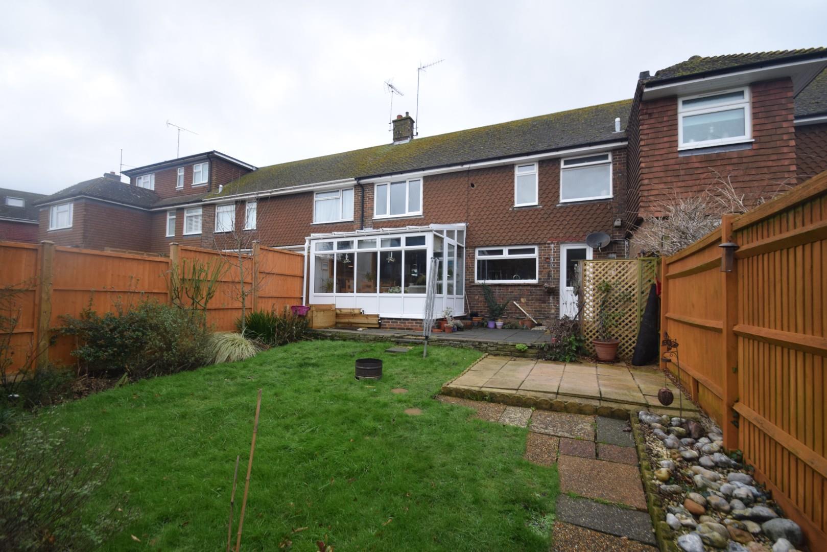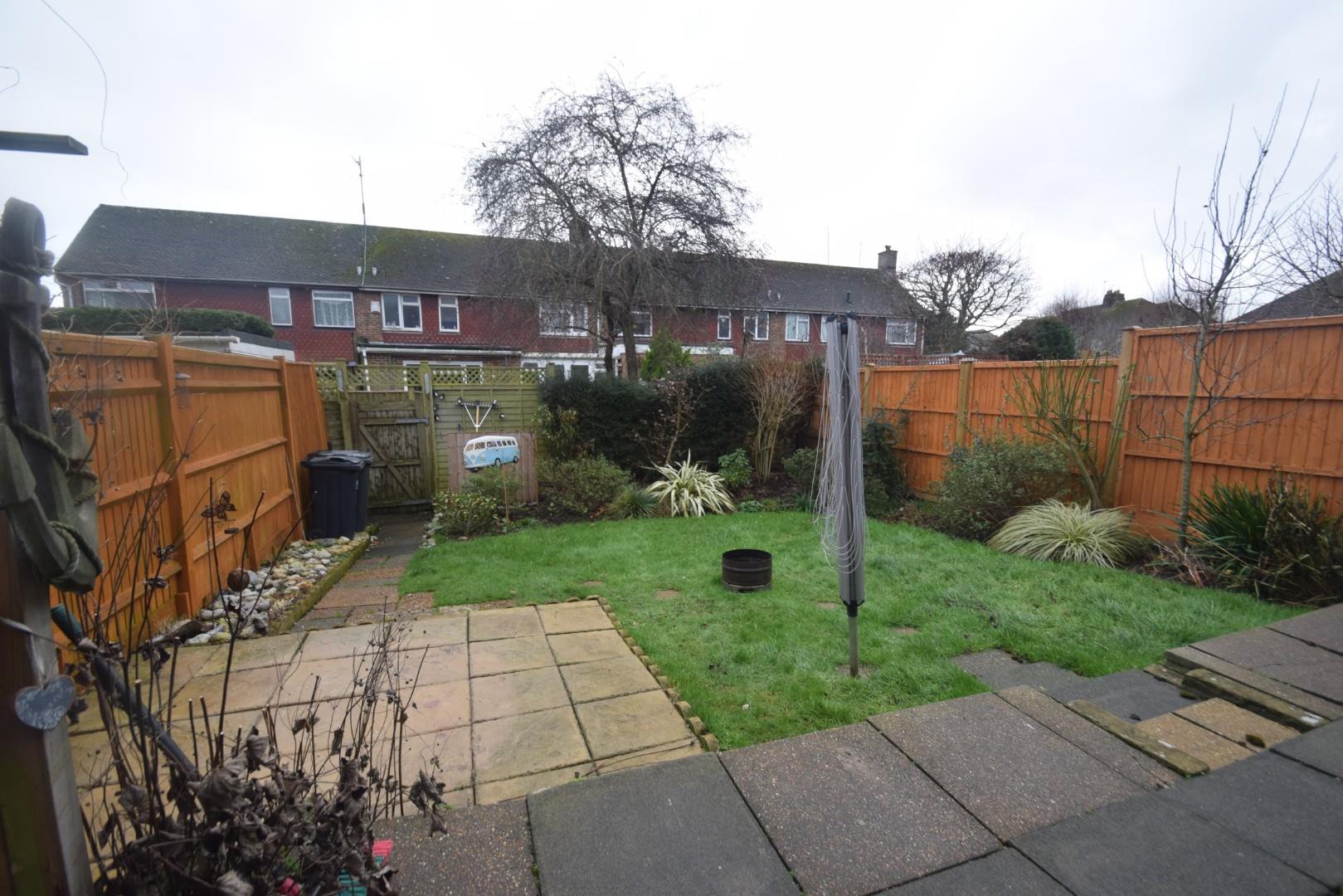 Ares of patio and lawn with established shrub border and gate giving access to thee rear.
