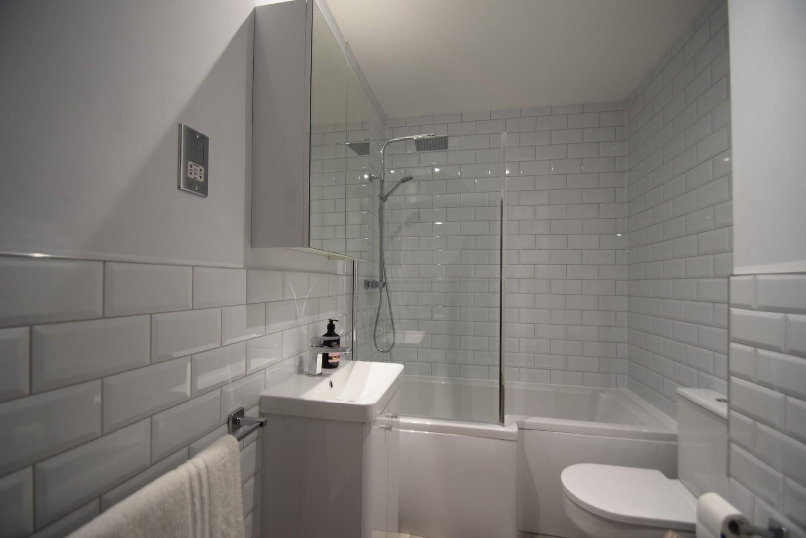 Fitted with a white suite comprising 'P' shaped bath with shower and screen, low level wc, hand basin with vanity cupboard. Extractor fan, shaver point, fan heater, partly tiled walls.