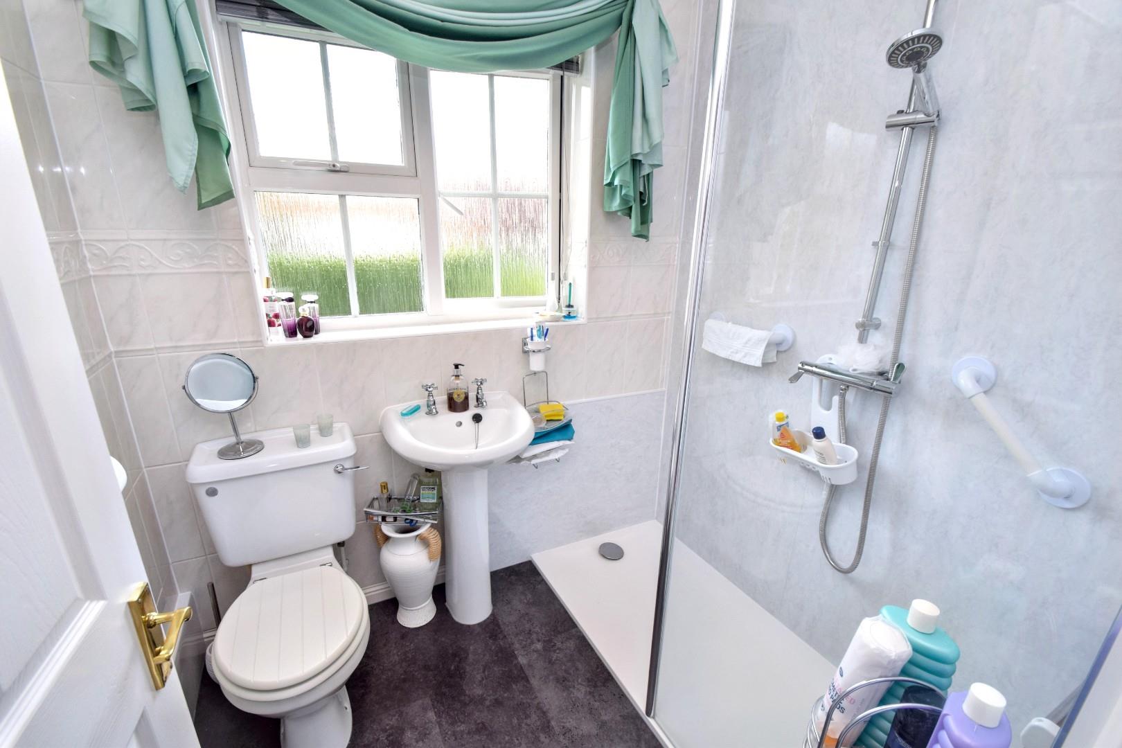 In a white suite comprising double sized shower cubicle, low-level WC, pedestal wash hand basin, part tiled walls, heated chrome towel rai,l double glazed window to rear.