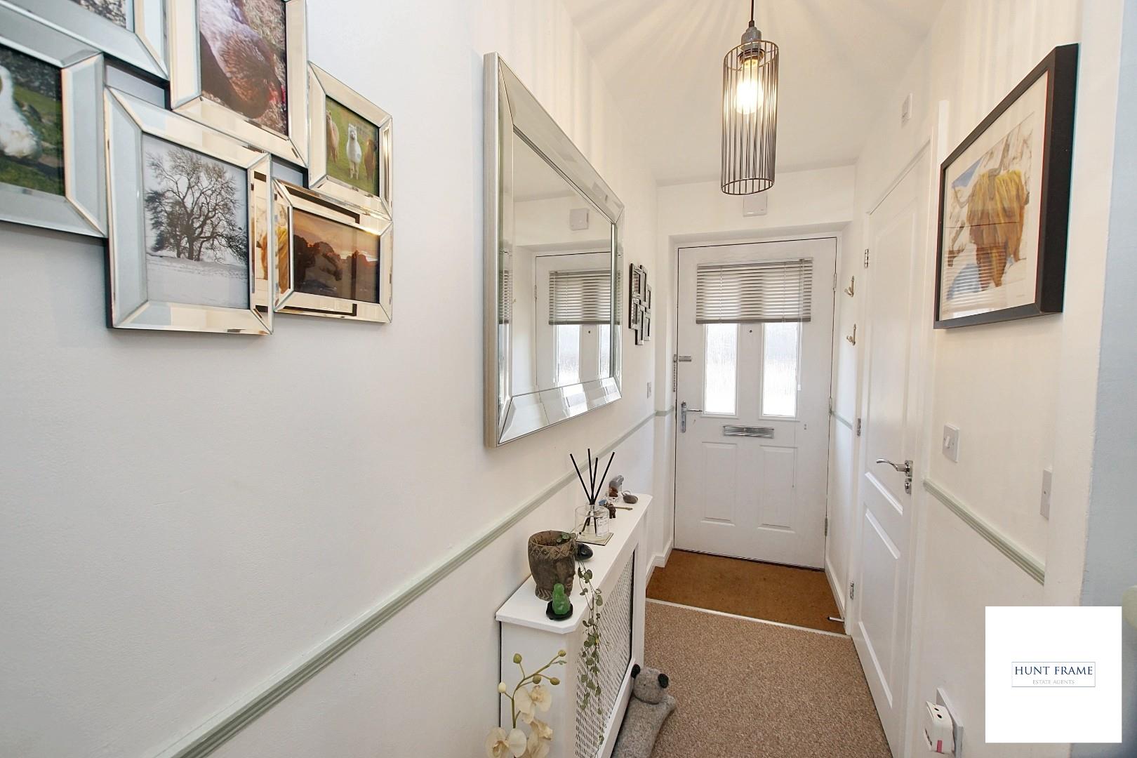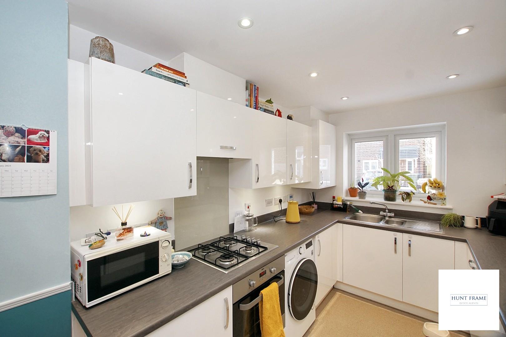 Modern fitted units in gloss white with wall mounted and floor standing cupboards, integral dishwasher, plumbing and space for a washing machine, worktop space, space for a freestanding fridge/freezer, matching upstands, inset one and half bowl sink unit with drainer and mixer tap, electric single oven with four ring hob and extractor unit over, double glazed window to the front aspect.