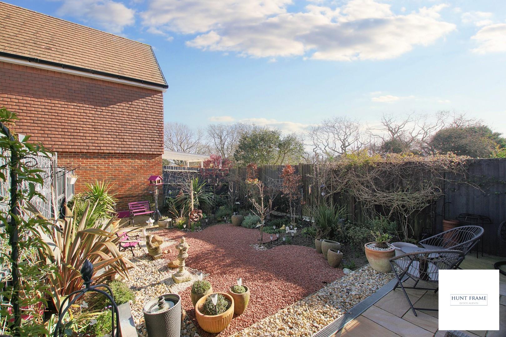 Extremely well presented and improved, private garden having been hard landscaped by the current owners with a terrace and gravelled display/seating areas, shaped planted borders with shrubs and roses etc, second paved seating area to the rear, personal door to the garage.
