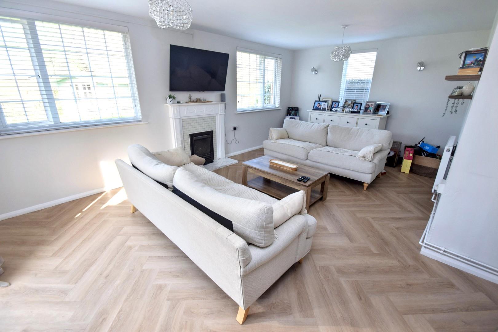 Wood effect flooring, two radiators, feature fireplace with fitted gas fire, Tv point, triple aspect with double glazed windows to two side and double glazed french doors to rear garden.