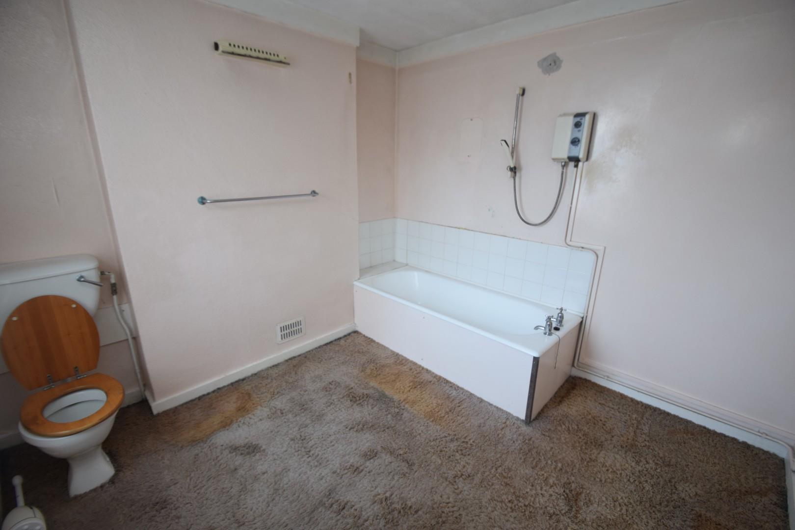 Suite comprising panelled bath with shower over, low level wc, wash basin, radiator, window to side.