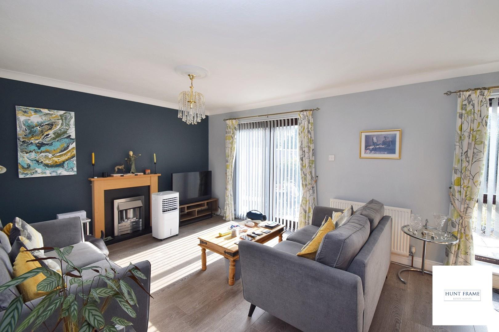 Double reception with sitting and dining areas with UPVC double glazed windows overlooking the rear elevation and gardens with UPVC sliding patio doors overlooking and giving access to the gardens as well, wood affect laminate flooring, two radiators, wooden fireplace surround with mantle and a inset electric fire.