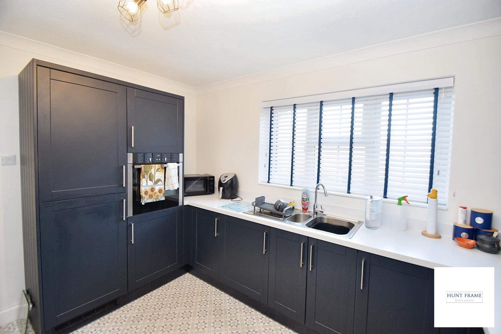 Refitted in Summer 2023 with an extensive range of floor standing and wall mounted units with quartz effect working surfaces, inset one and a half bowl sink unit with mixer tap and drainer, matching up stands, Integrated washer/dryer, integrated fridge/freezer, eye level Neff electric oven with matching four ring induction hob to the side with a canopied stainless steel extractor above with a glass splashback, deep pan drawers and corner carousel units, breakfast bar area, radiator, UPVC double glazed window to the front elevation, vinyl flooring.