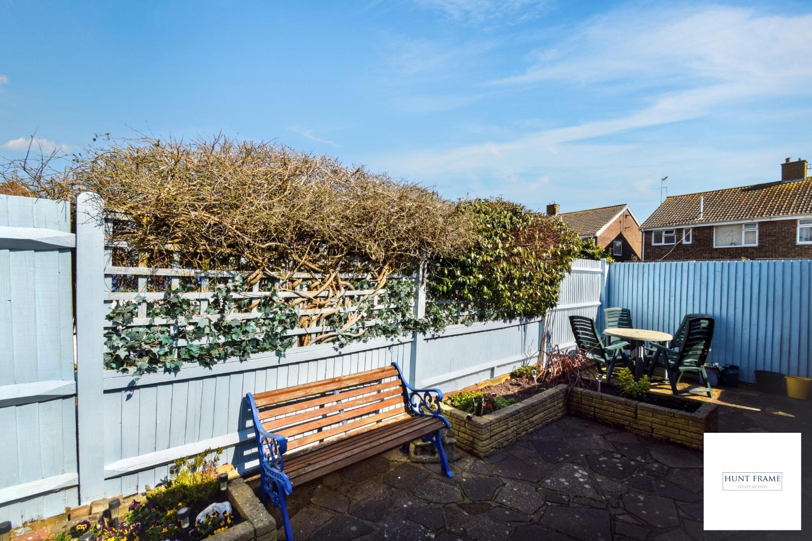 Mainly laid to paving with raised display borders, fenced boundaries, access to the dining room, kitchen and garage.