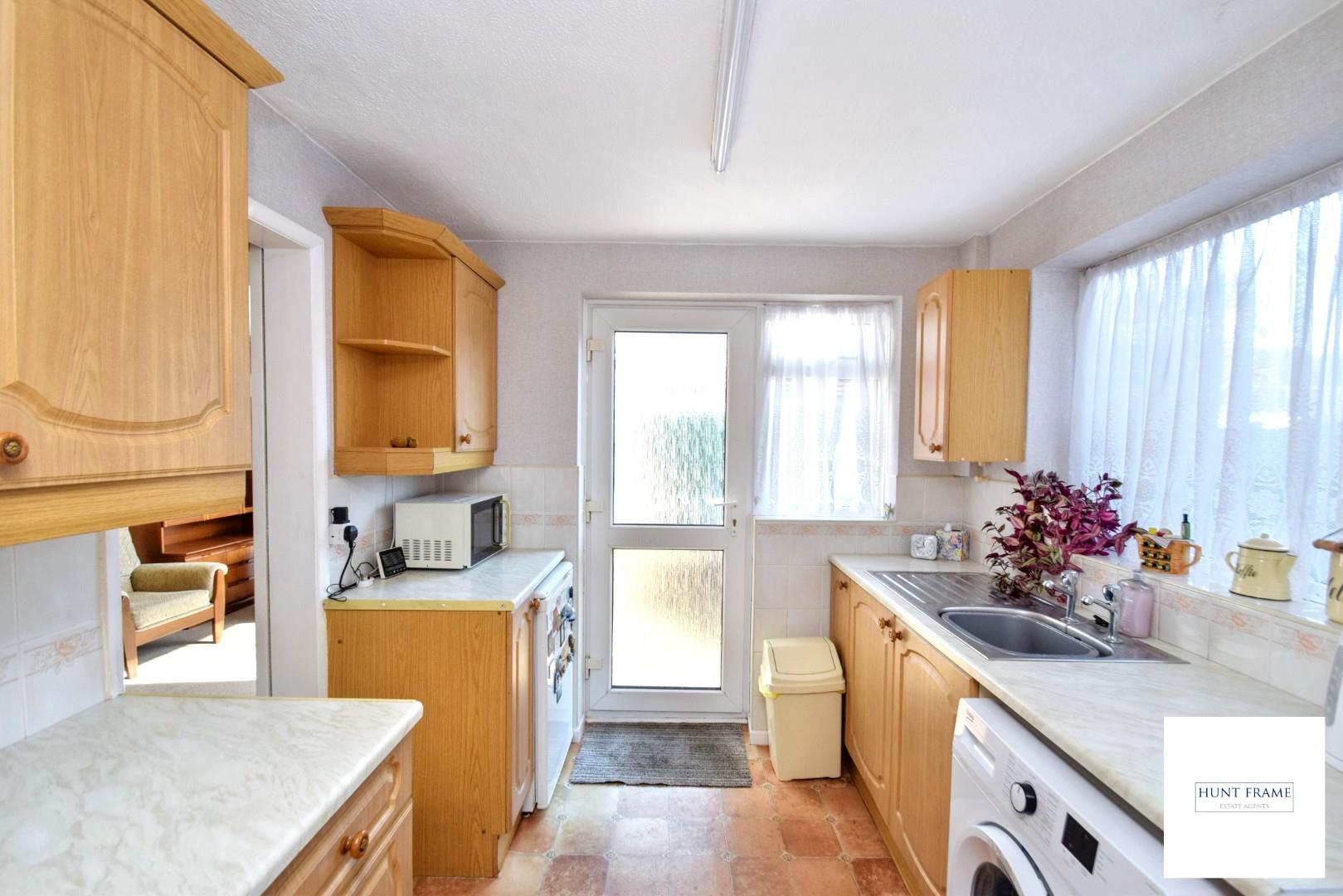Range of floor standing and wall mounted units with worktop space, inset sink unit, plumbing and space for a washing machine, space for a freestanding oven, further under counter appliance space, door to the dining room, return door to the hallway, window to the side aspect, door giving access to the garage and gardens.