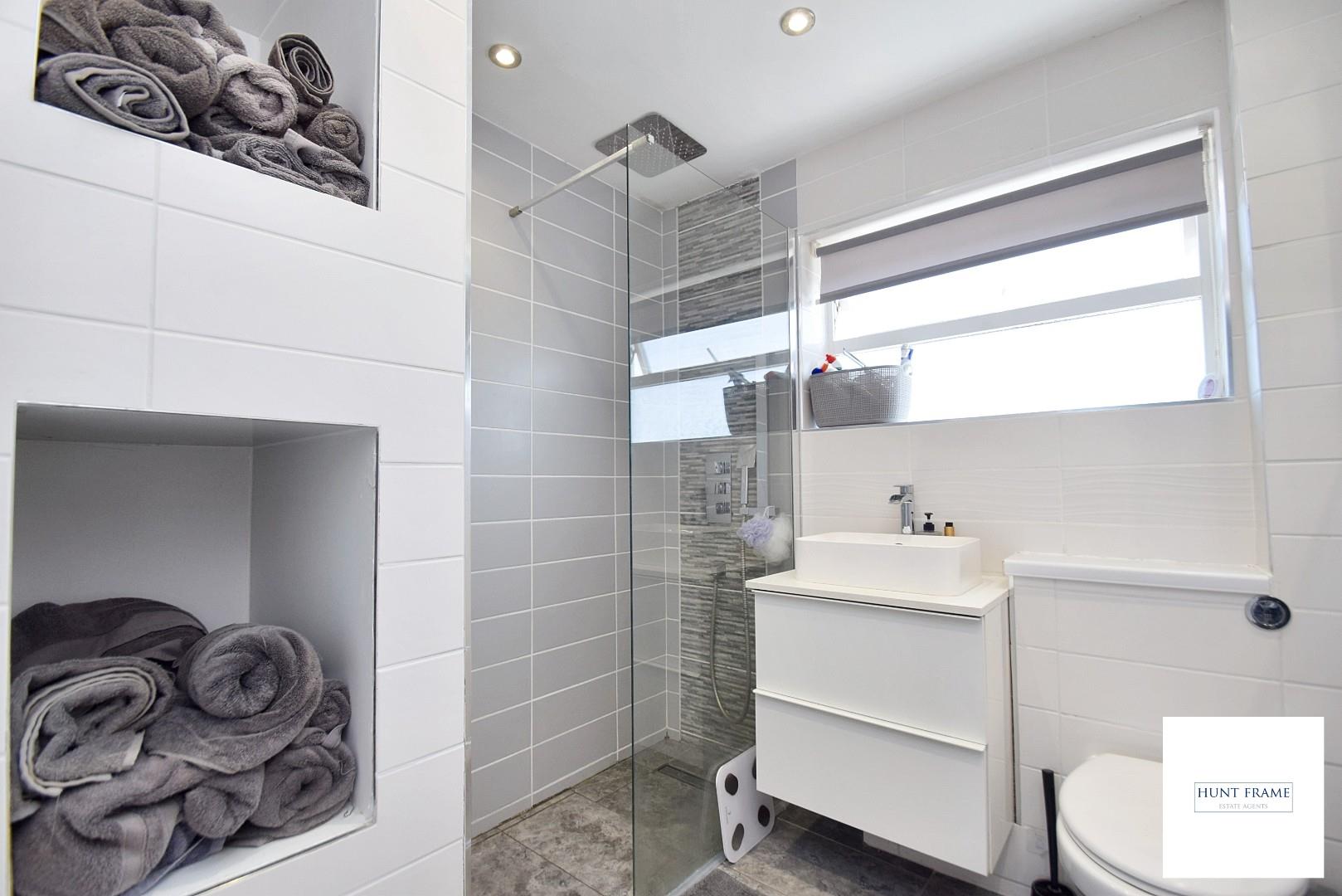 Updated shower room and comprising of a large enclosed shower cubicle with glass fixed screen being fully tiled with ceiling mounted rainfall shower unit with a secondary hand held shower attachment, two large recesses for towel storage etc, low level WC with a concealed cistern, wash hand basin set in a vanity unit with cupboards beneath with contemporary mixer tap, fully tiled walls, ladder style radiator, tiled flooring, UPVC double glazed patterned window to the front elevation.