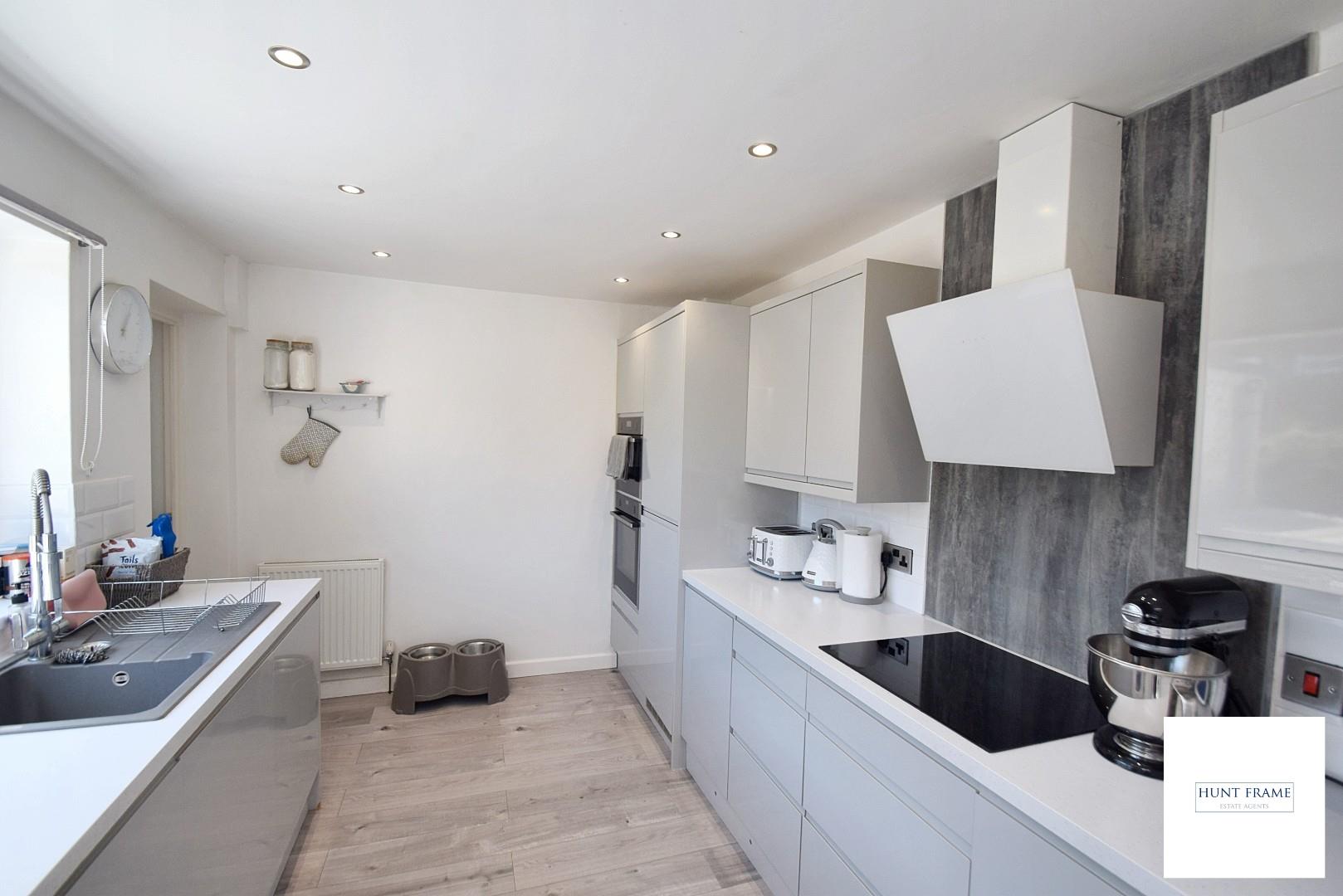 An extensive range of light grey, gloss fronted floor standing and wall mounted units with complementary quartz effect worktops, integral fridge and freezer, eye level Neff double ovens with a Neff four ring induction hub to the side with a contemporary extractor unit above with splashback, integral dishwasher, plumbing and space for a washing machine, Blanco sink unit with drainer and extendable mixer tap, part tiling to walls, recessed ceiling lighting, UPVC double glazed window to the front aspect, radiator, door to the separate Wc.