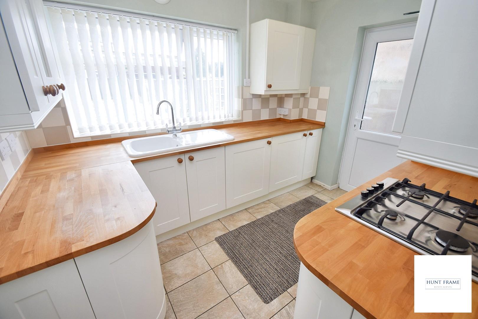 Fitted in a range of wall and base mounted cupboards and drawers. Work tops with inset sink and single drainer unit with mixer tap. Built in double oven and four ring gas hob with extractor hood above. Integrated washing machine and tumble dryer, casing for upright fridge/freezer, radiator, tiled floor, double glazed window to rear, double glazed door to side.