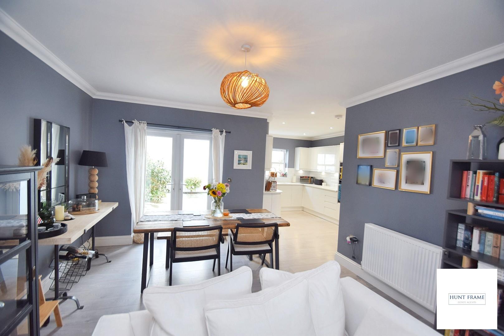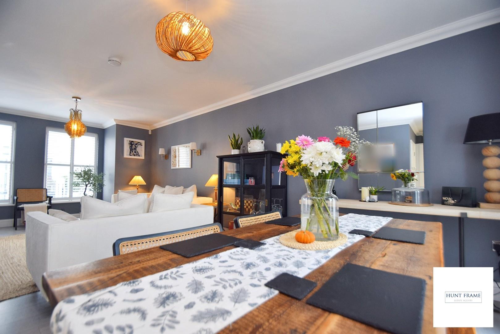 Beautifully presented and dressed double reception room providing distinct seating and dining areas, access either from the hallway or kitchen area, large double glazed sash bay window to the front aspect with fitted shutters, matching flooring, numerous wall points, coving, open to the dining area, two radiators, UPVC double opening French doors giving access and overlooking the patio garden, open to the kitchen.