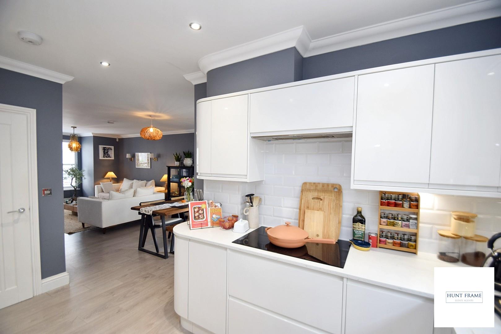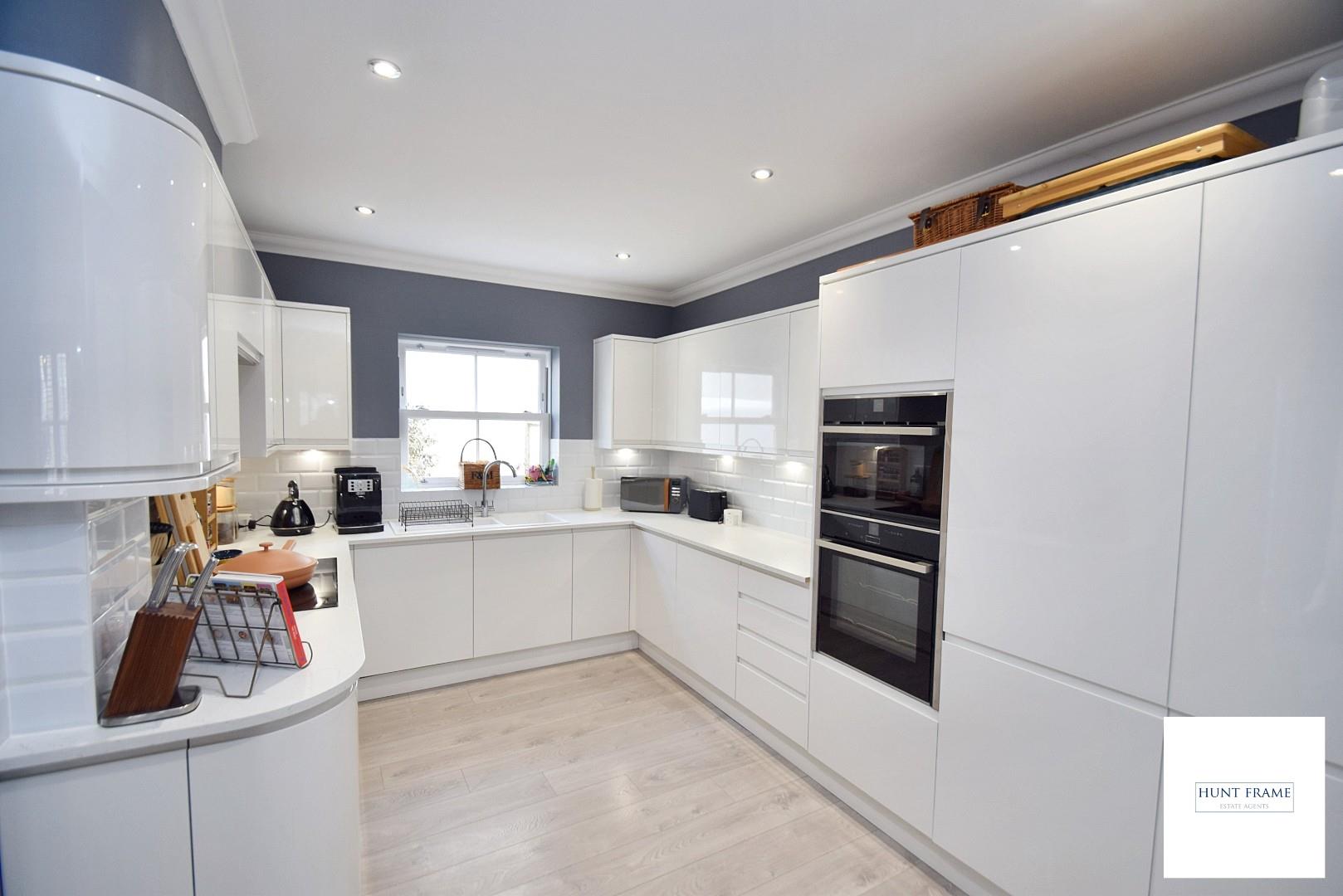 Delightful modern kitchen with an extensive range of floor standing and wall mounted cupboards with white gloss doors and drawers with 'J' line handles, complementary marble effect work surfaces, inset one and a half bowl sink unit with a swan neck mixer tap, large pan drawers, eye level double oven with adjacent integrated fridge/freezer, integral Bosch washing machine and dishwasher, five ring Neff induction hob with extractor unit over, Victorian style tiled splashbacks, recessed ceiling lighting, matching flooring, double glazed window to the rear aspect.
