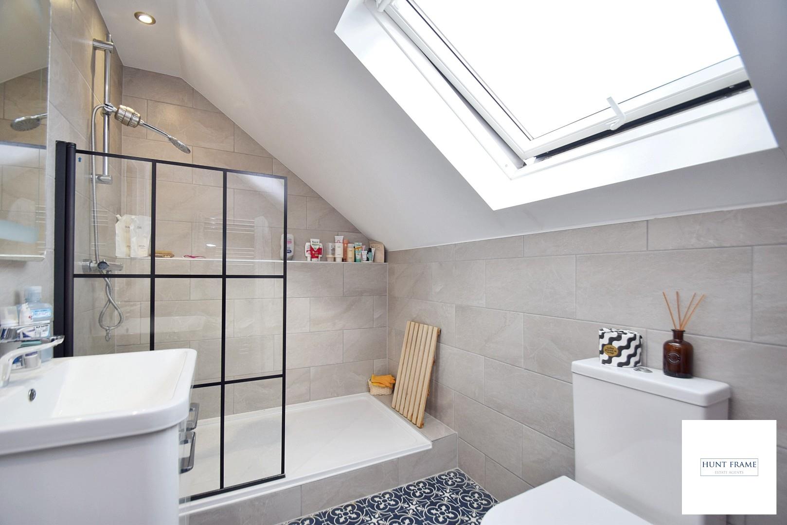 Comprising of a bath with shower screen and twin head rainfall shower system, towel heater, Victorian style flooring, low-level WC with a concealed cistern, wash hand basin set in a vanity unit with a cupboard beneath, large mirror above, part tiling to walls, double glazed patterned sash window to the rear aspect, large cupboard concealing the wall mounted boiler, hot water tank and controls etc.
