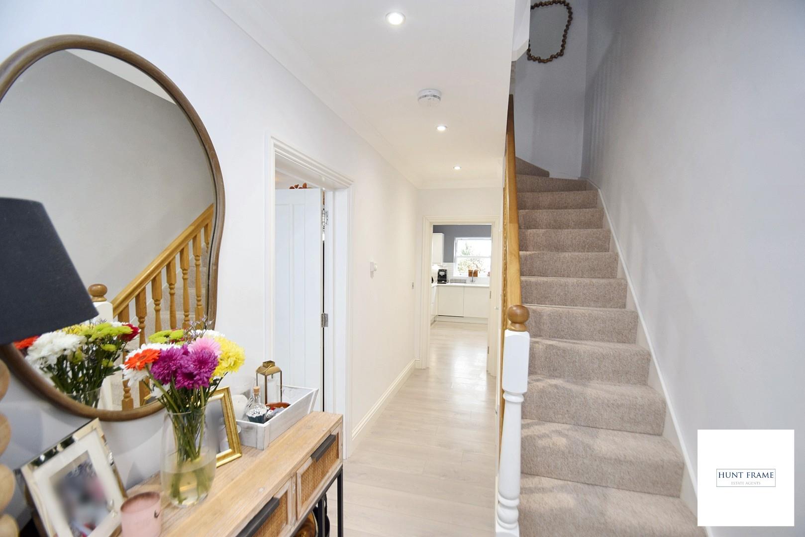 Composite and glazed entrance door with glass panel above, access into the hallway, part wall panelling, radiator, large storage cupboard, staircase to the first floor, doors off to the sitting room, kitchen and cloakroom, light oak effect laminate flooring, under the stairs storage cupboard.