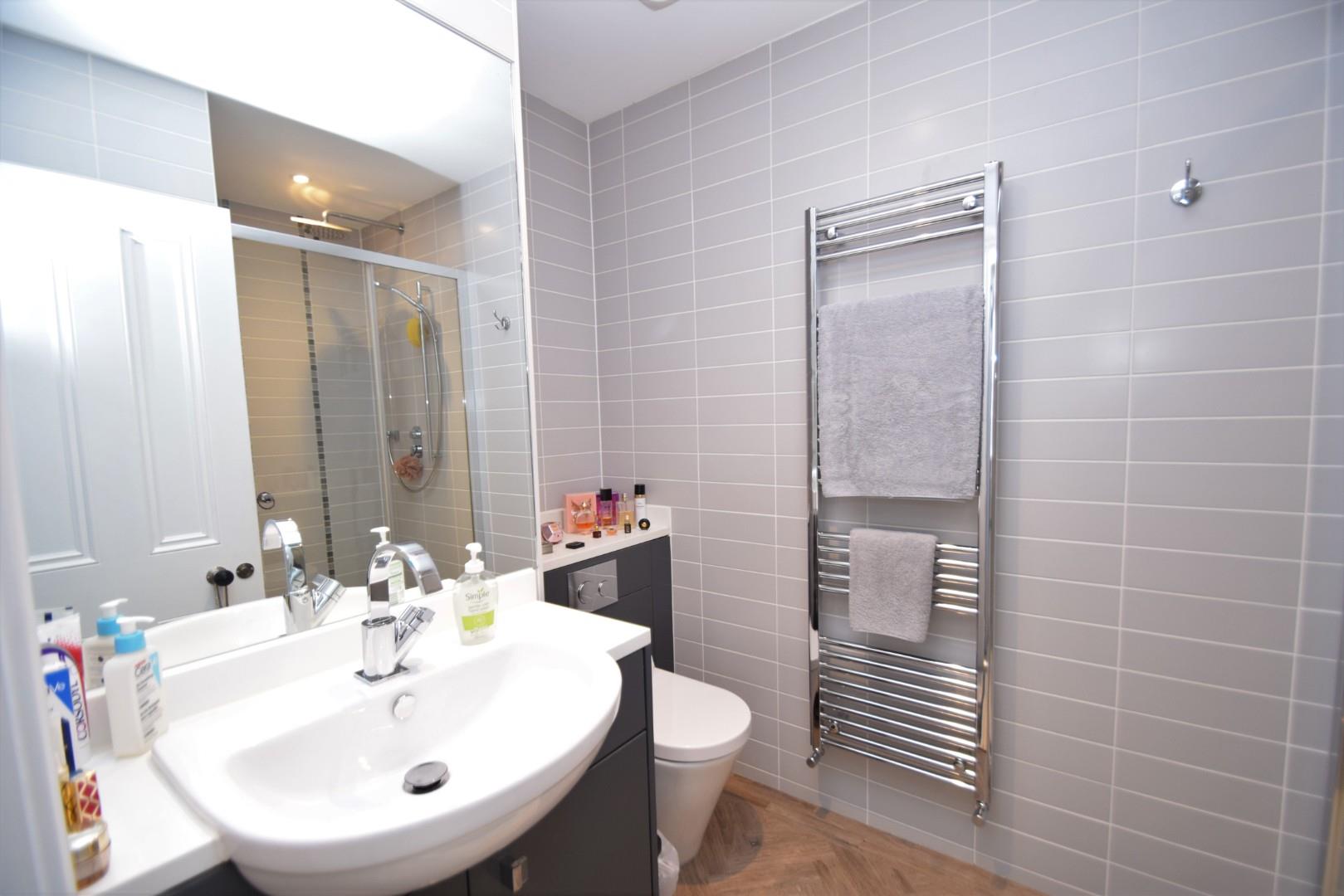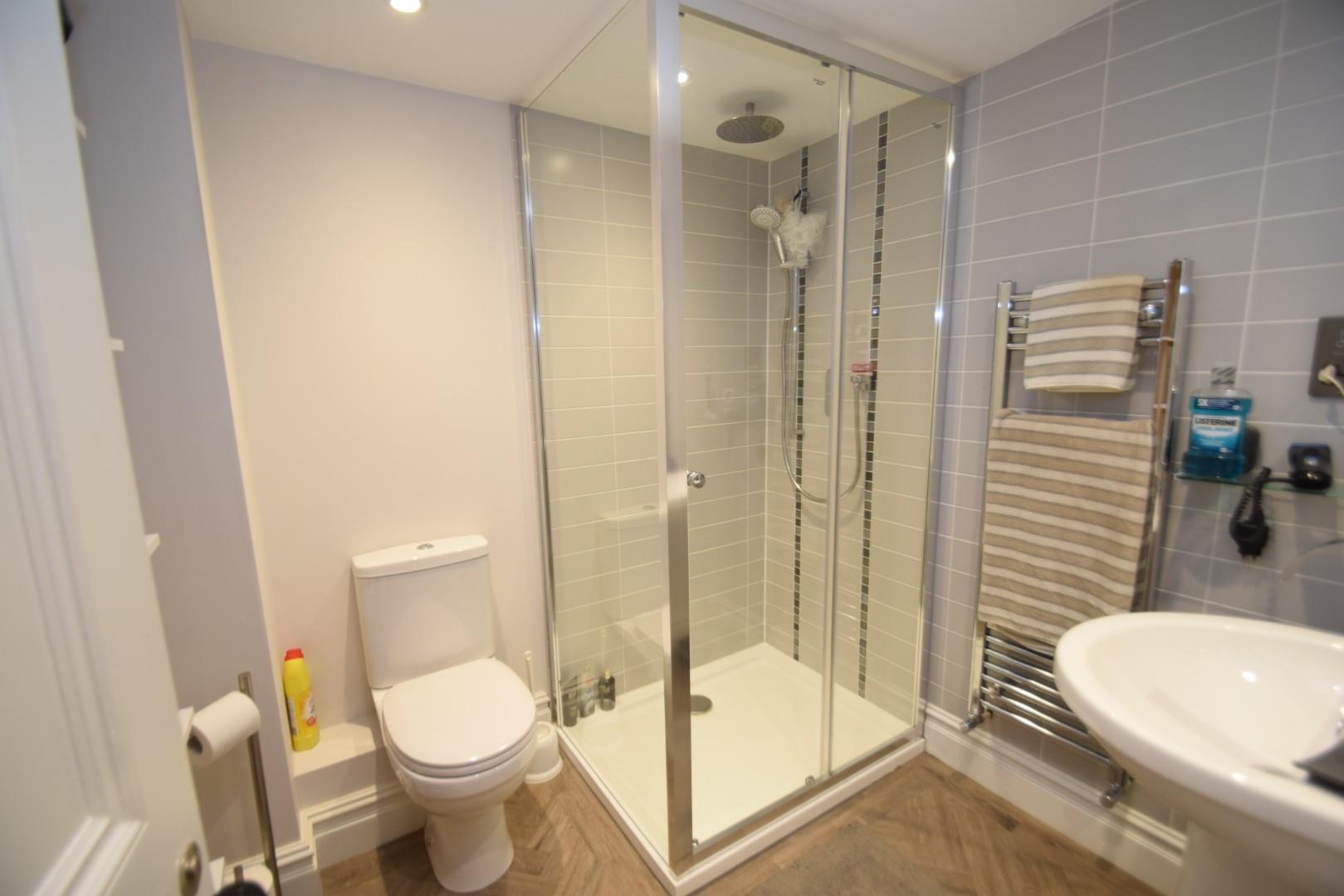 Modern suite comprising shower enclosure, hand basin with vanity unit, and low flush w.c. Extractor fan, heated towel rail.