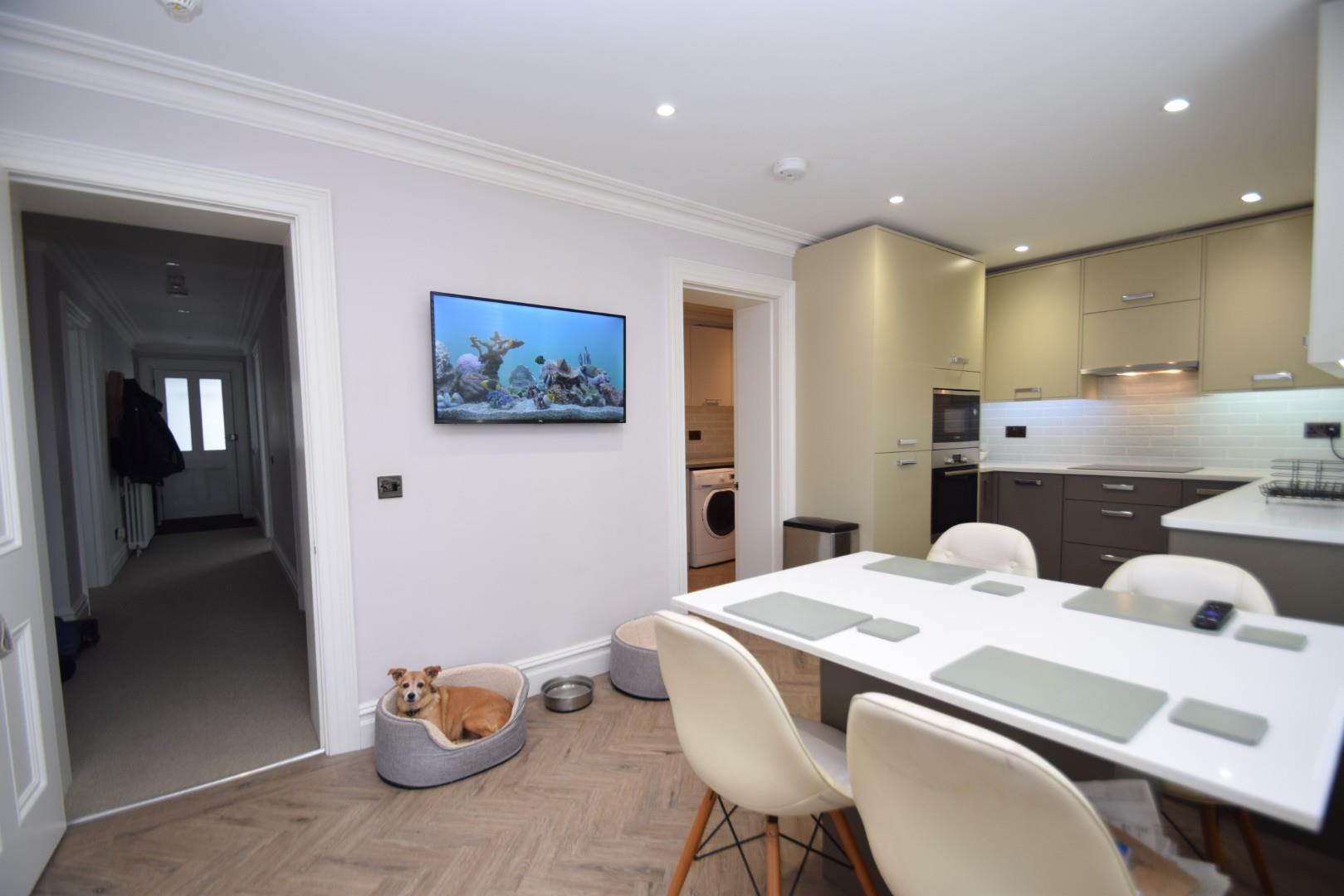 Window and door to rear, opening onto the private patio. Fitted with a range of modern wall and base mounted units with quartz worksurfaces and tiled splash backs, one and a half bowl sink with drainer, integrated fridge freezer, electric oven, dish washer and microwave. Concealed, wall mounted gas boiler.
