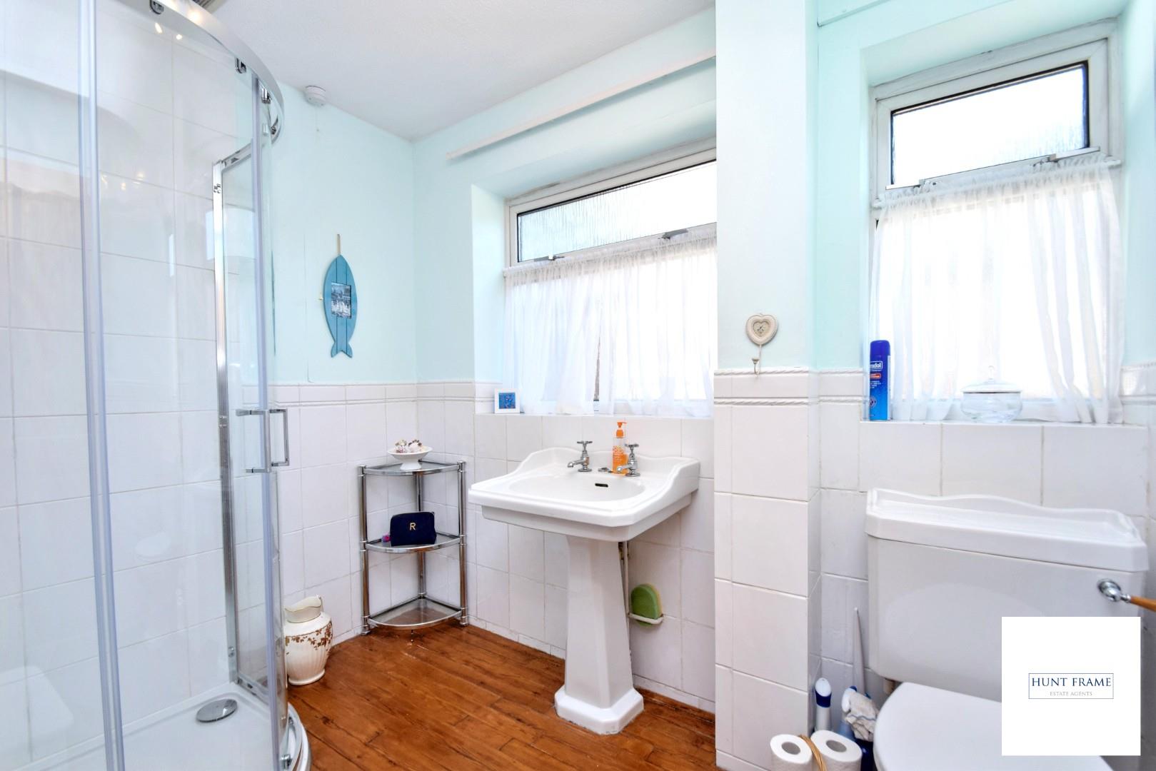 Updated shower room with a corner shower cubicle with sliding doors to the front being fully tiled with a shower unit, large Victorian style pedestal wash hand basin with a matching low-level WC ,stripped Pine flooring, part tiling to walls, UPVC double glazed windows to the side aspect, upright ladder style radiator, ceiling extractor fan.