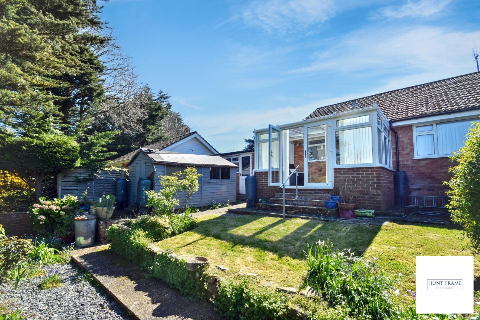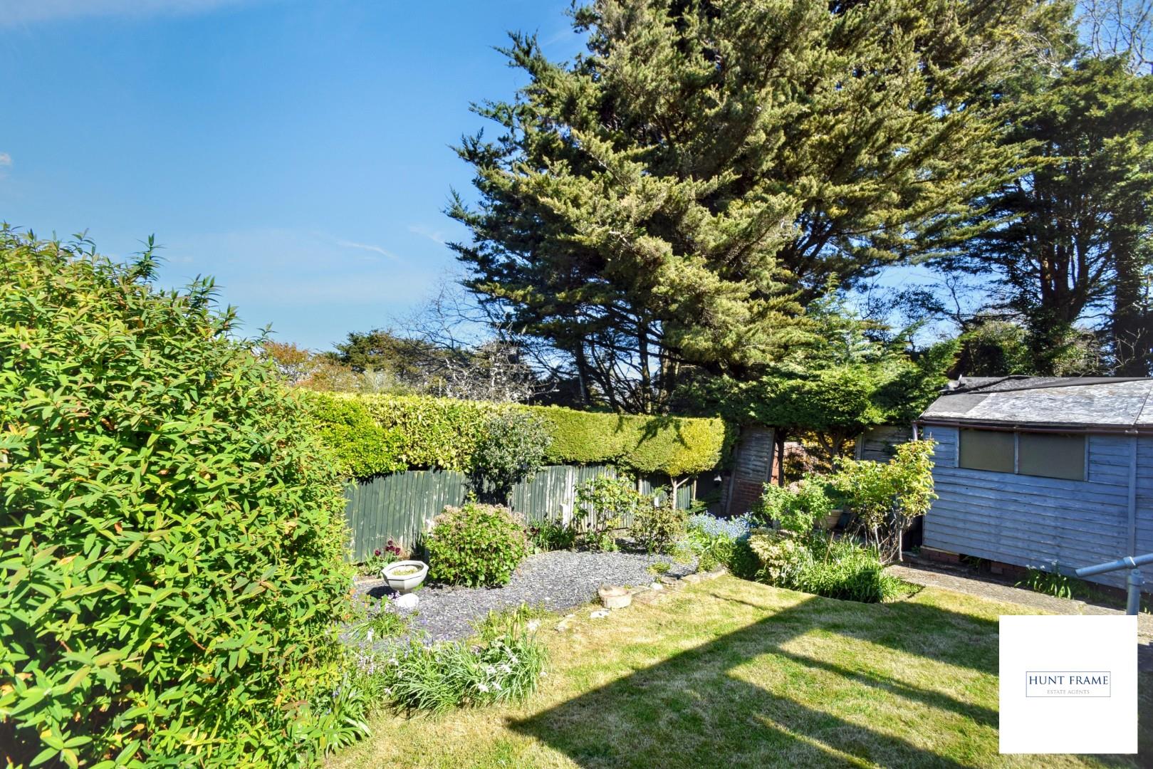 Benefiting from a terrace to the side with an area of lawn and a large slate display bed to the rear with fenced boundaries, beds and borders with mature shrubs, a pathway leads to the front access and timber storage shed (in some disrepair) and garage.