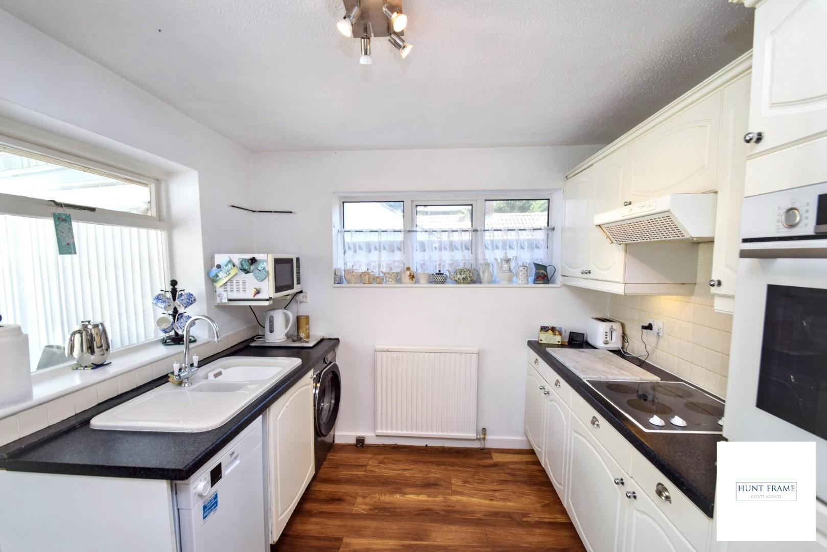 Fitted with a range of modern floor standing and wall mounted units to include glazed display cupboards, under counter appliance spaces, plumbing and space for a slimline dishwasher and washing machine, eyelevel Bosch electric oven with a four ring electric hob to the side with an extractor unit over, part tiling to walls, inset ceramic one and a half bowl sink unit with a Swan neck mixer tap, radiator, UPVC double glazed windows to the side aspect and another window and glazed door overlooking and giving access to the conservatory.