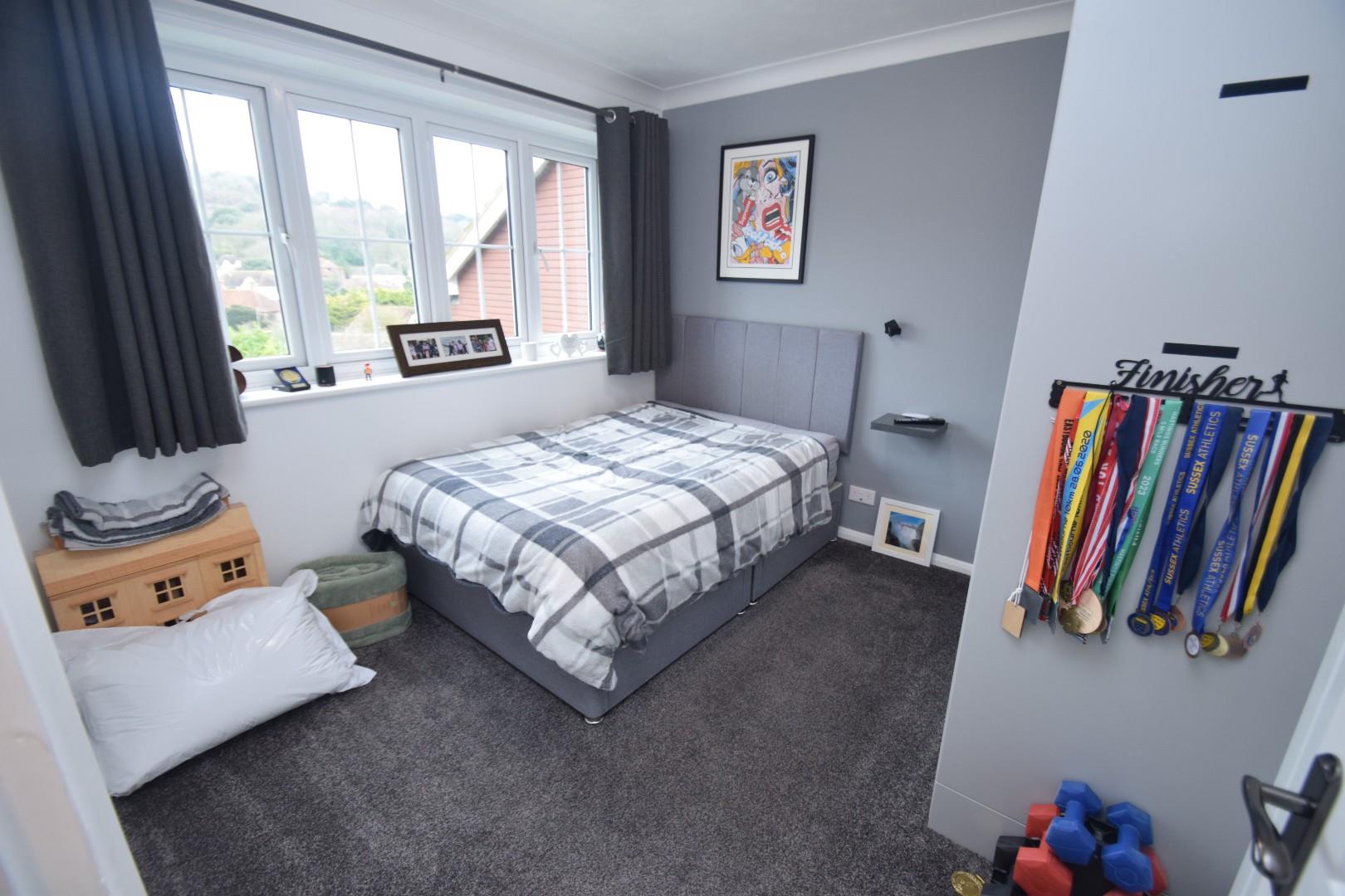 Window giving superb views towards the Downs. Range of built-in wardrobes with drawers below. Tv aerial.. Contemporary vertical radiator.