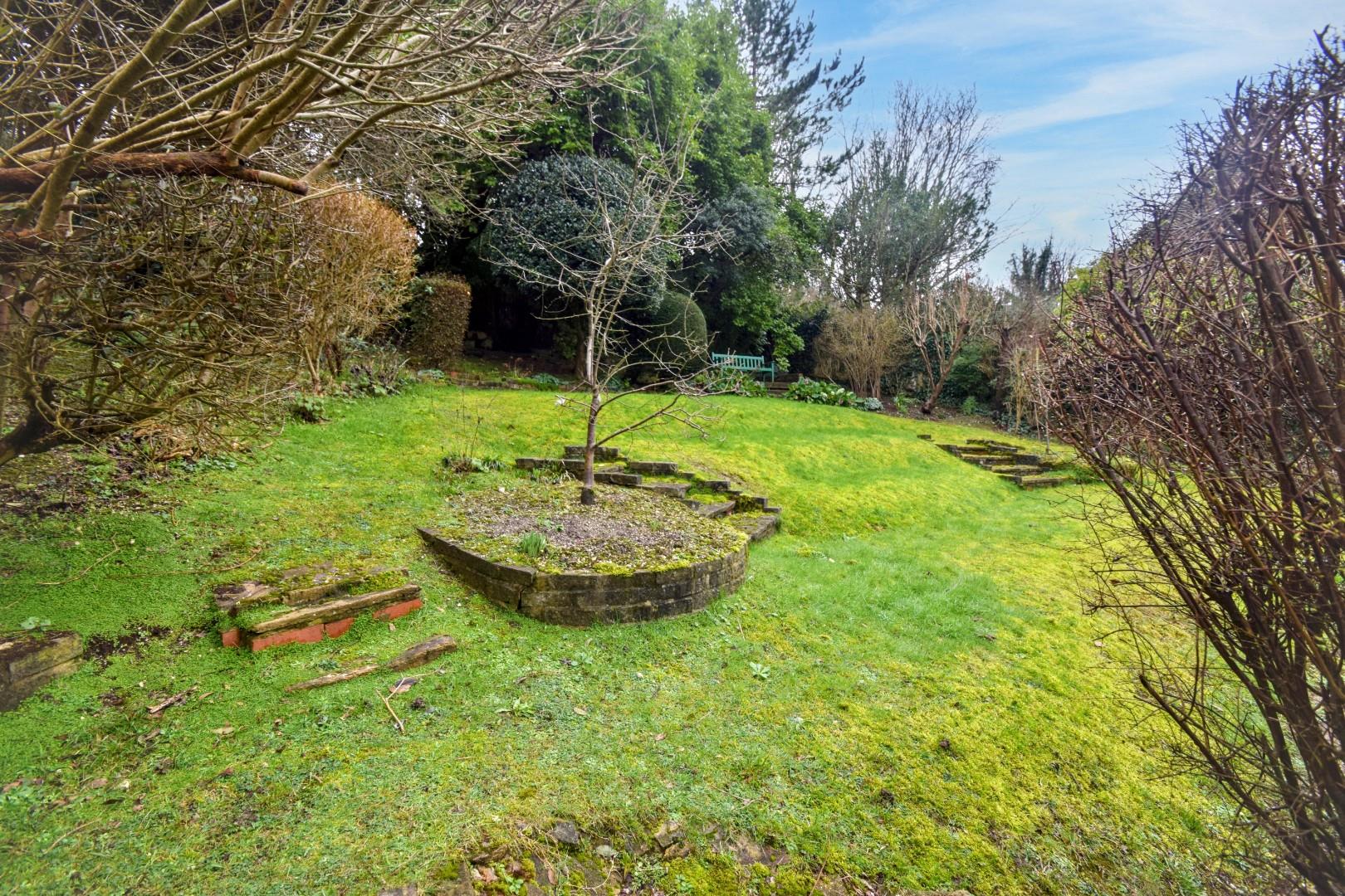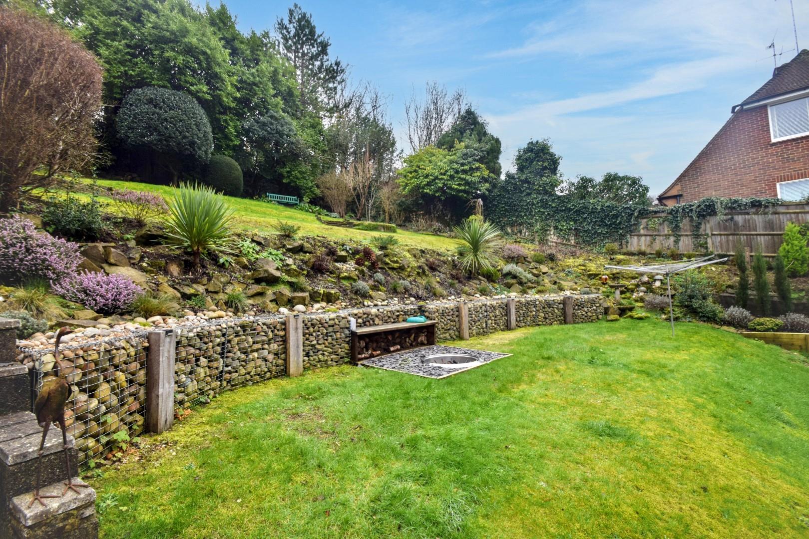 Laid as decked terrace with direct access from both the living room and orangery. Further area of lawned garden with established rockery with various trees and shrubs. Fenced surround with gated access leading directly onto the Downs.