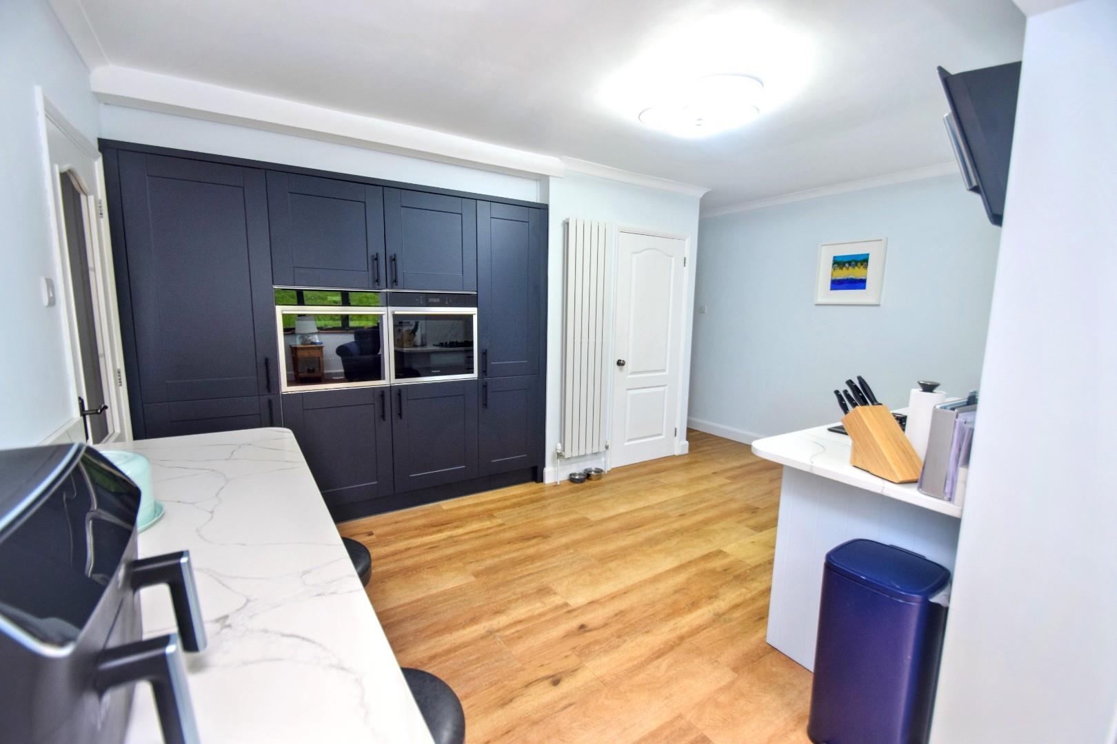 Fitted in a range of Shaker style wall and base level units and drawers with complementary marble effect quartz work surfaces over. Under mounted Belfast style sink with mixer tap. Inset four ring gas hob with extractor canopy above. Further range of tall units providing housing for two electric ovens with cupboards above and below. Adjoining matching broom cupboard and shelved cupboard. Deep walk-in larder. Contemporary vertical radiator. Wide opening to: