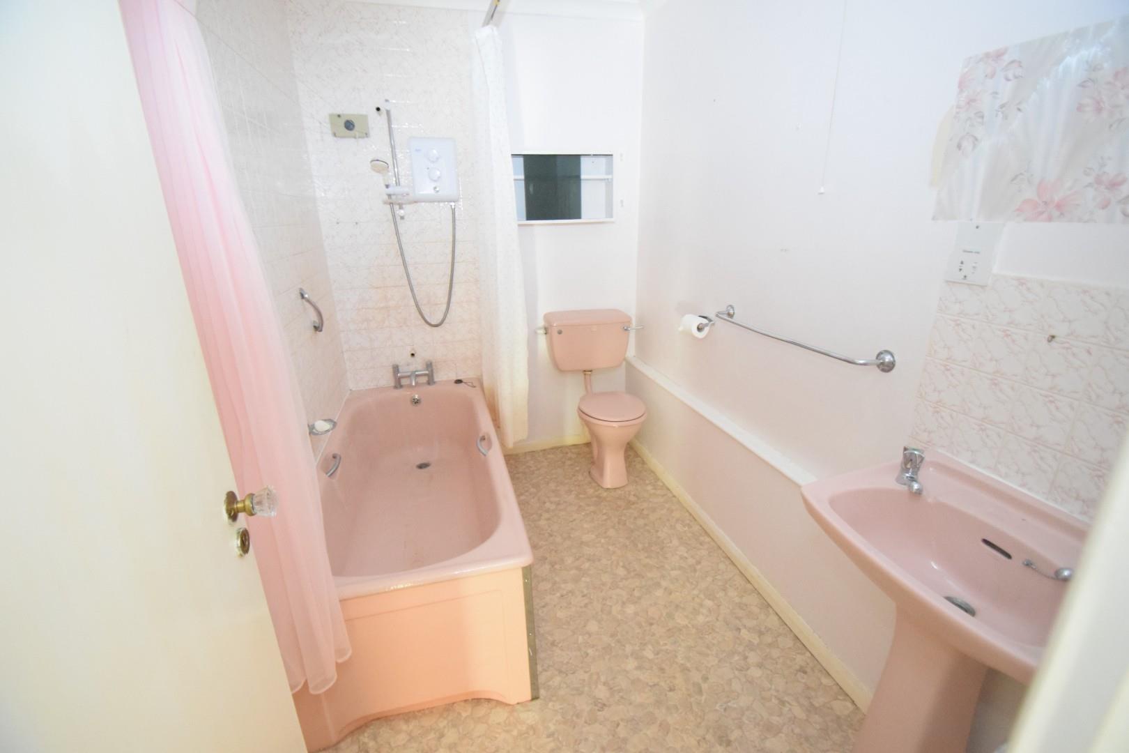 Suite comprising panelled bath with electric shower above, pedestal wash basin and low level wc. Heated towel rail.