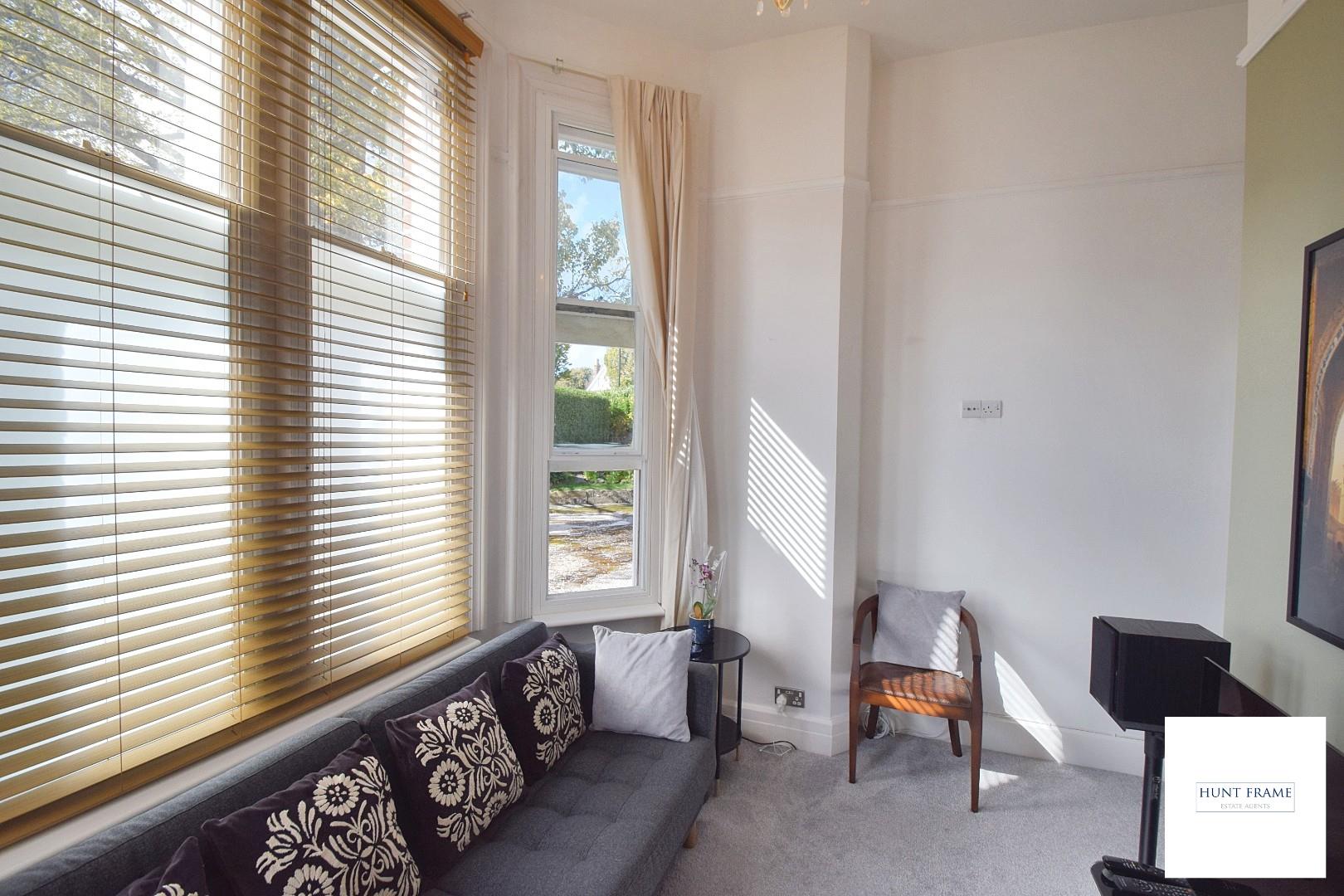 Picture rail, glazed panel, at a high level, borrowing light from the sitting room, recess for freestanding furniture/wardrobe.