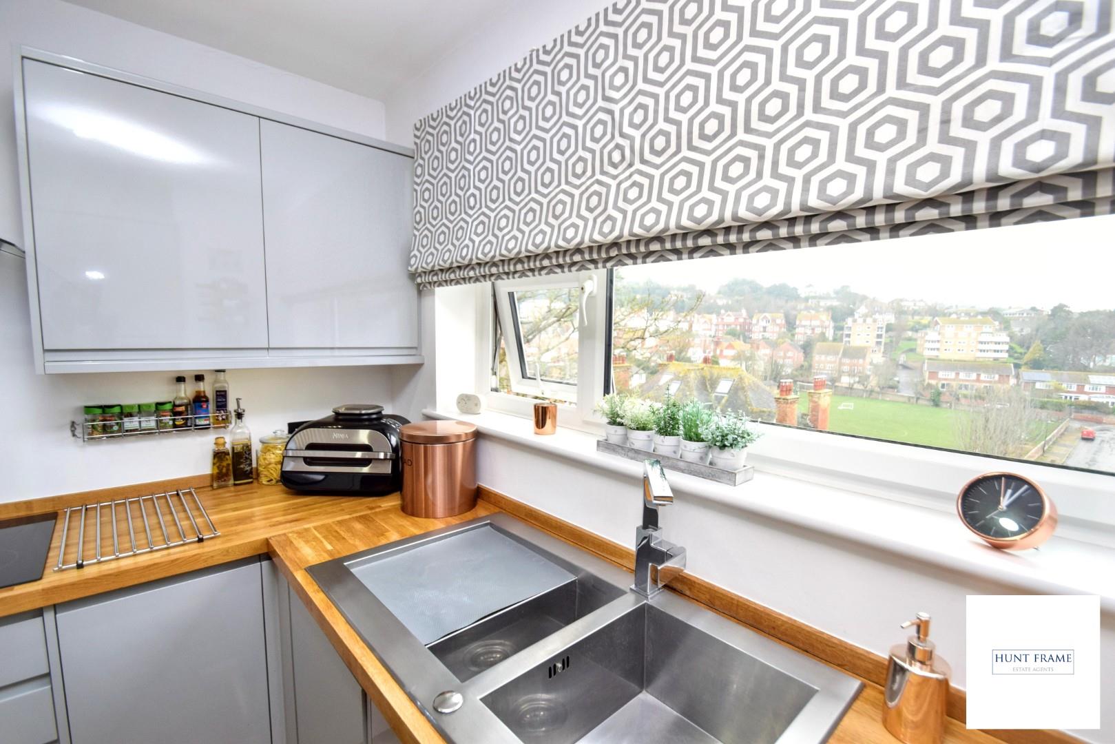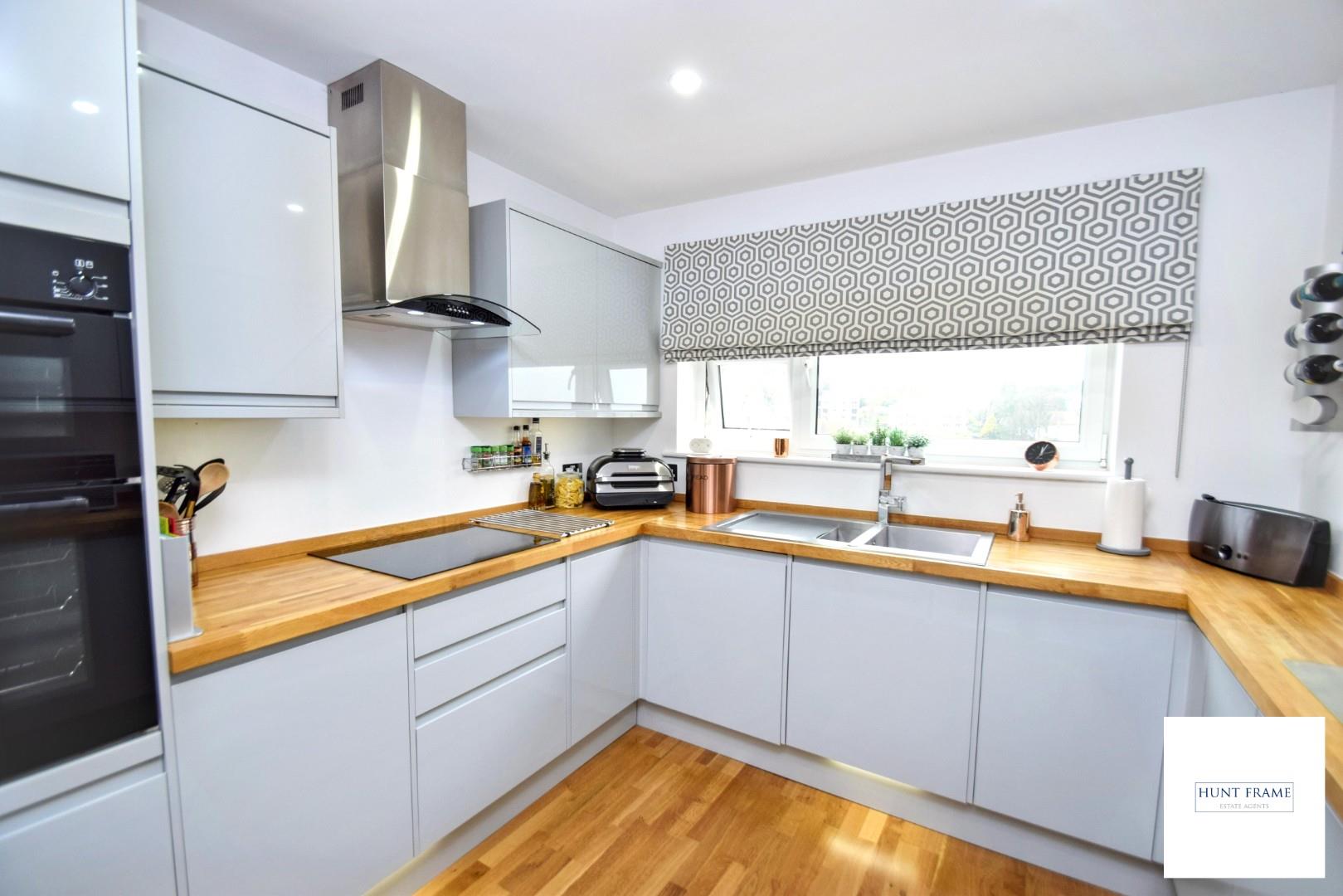 Refitted modern kitchen with a range of grey, gloss fronted wall mounted and floor standing units with wood block worktops, eye level double ovens with a four ring induction hob to the side with a canopied extractor unit over, inset one and half bowl sink unit with mixer tap and drainer, kick panel lighting, space for an upright fridge/freezer, integrated washing machine, radiator, UPVC double glazed window to the front elevation with lovely, elevated far reaching views across Meads.