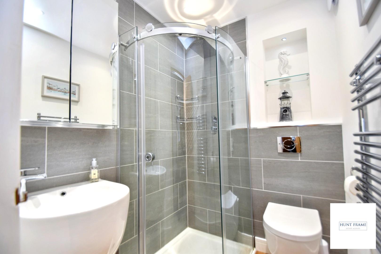 Luxury shower room with a large enclosed shower cubicle with fitted shower system, partly tiled walls, 'floating' wash hand basin with tiled splashbacks, recess with display shelving, ladder style radiator, recessed ceiling lighting, low level Wc with a concealed cistern.
