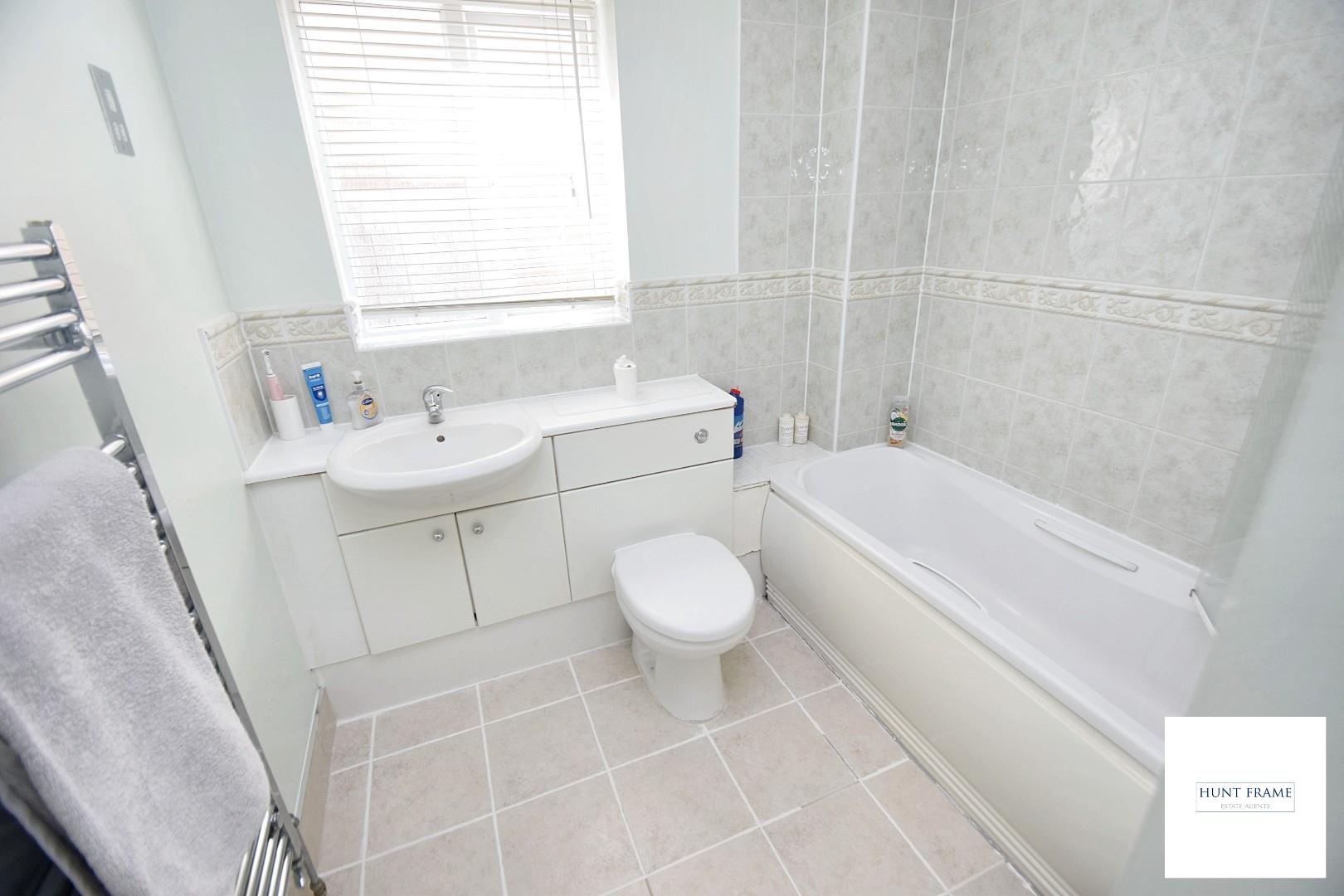 In a white suite comprising panelled bath with mixer tap and shower over, vanity unit with inset sink, low level wc and cupboards below. Electric shaver point, radiator, double glazed window to side.