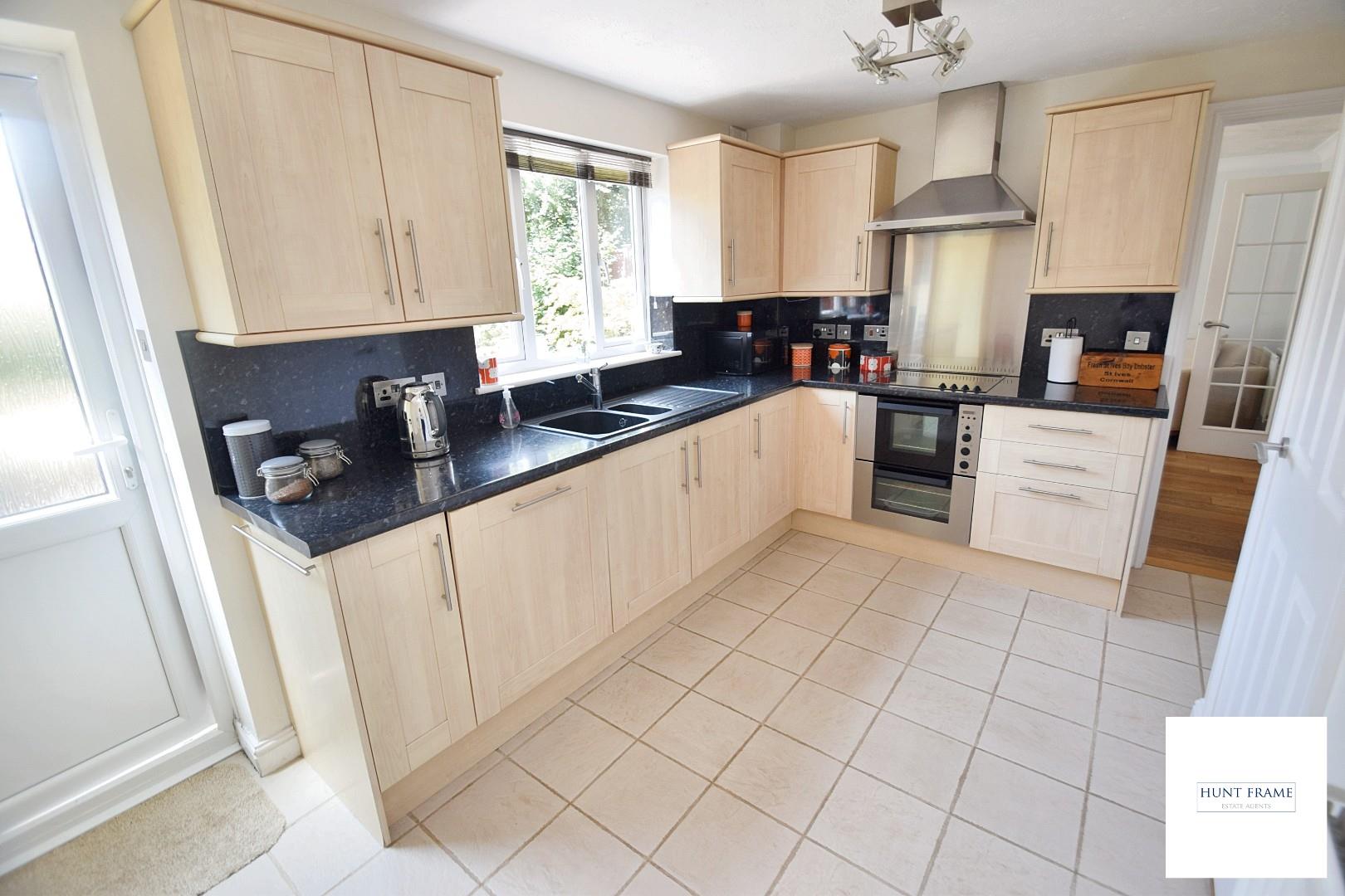 Fitted in a range of wall and base mounted cupboards and drawers. Work tops with inset sink and single drainer unit with mixer tap. Built in double oven and four ring electric hob with extractor hood above. Integrated dishwasher and fridge/freezer. Built in shelved cupboard, tiled floor, space for breakfast table and chairs, double glazed window and door leading to rear garden.