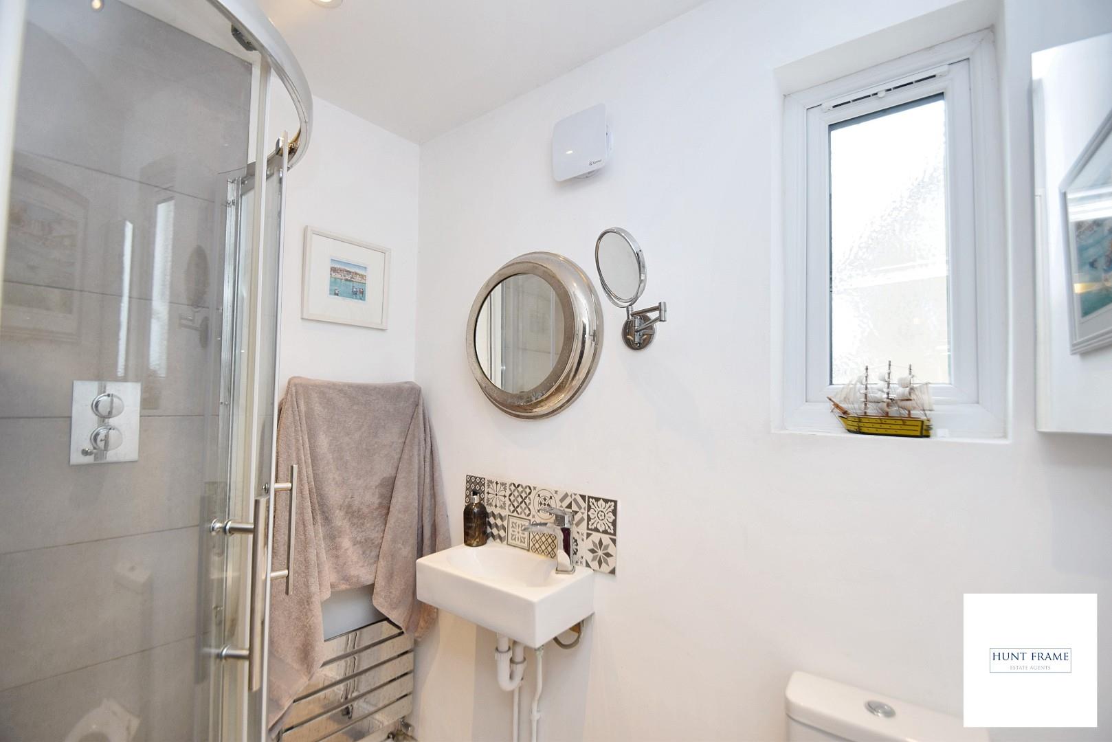 Shower cubicle with a rainfall shower system. Wash hand basin. Low level WC. Heated towel rail. Extractor fan. Double glazed window to side aspect.