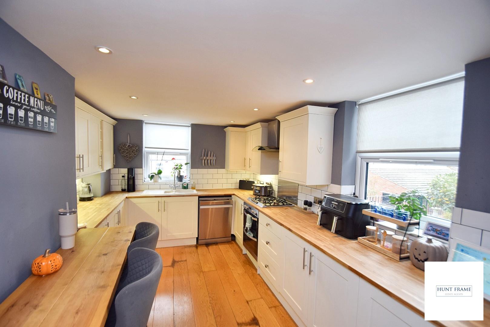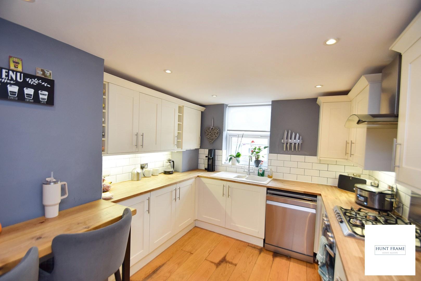 Fitted kitchen comprising a range of floor standing and wall mounted units with solid wood block work surfaces. Inset sink and drainer. Electric oven with gas hob and cooker hood over. Concealed wall mounted boiler. Integral dishwasher. Double glazed windows to rear and side aspects.