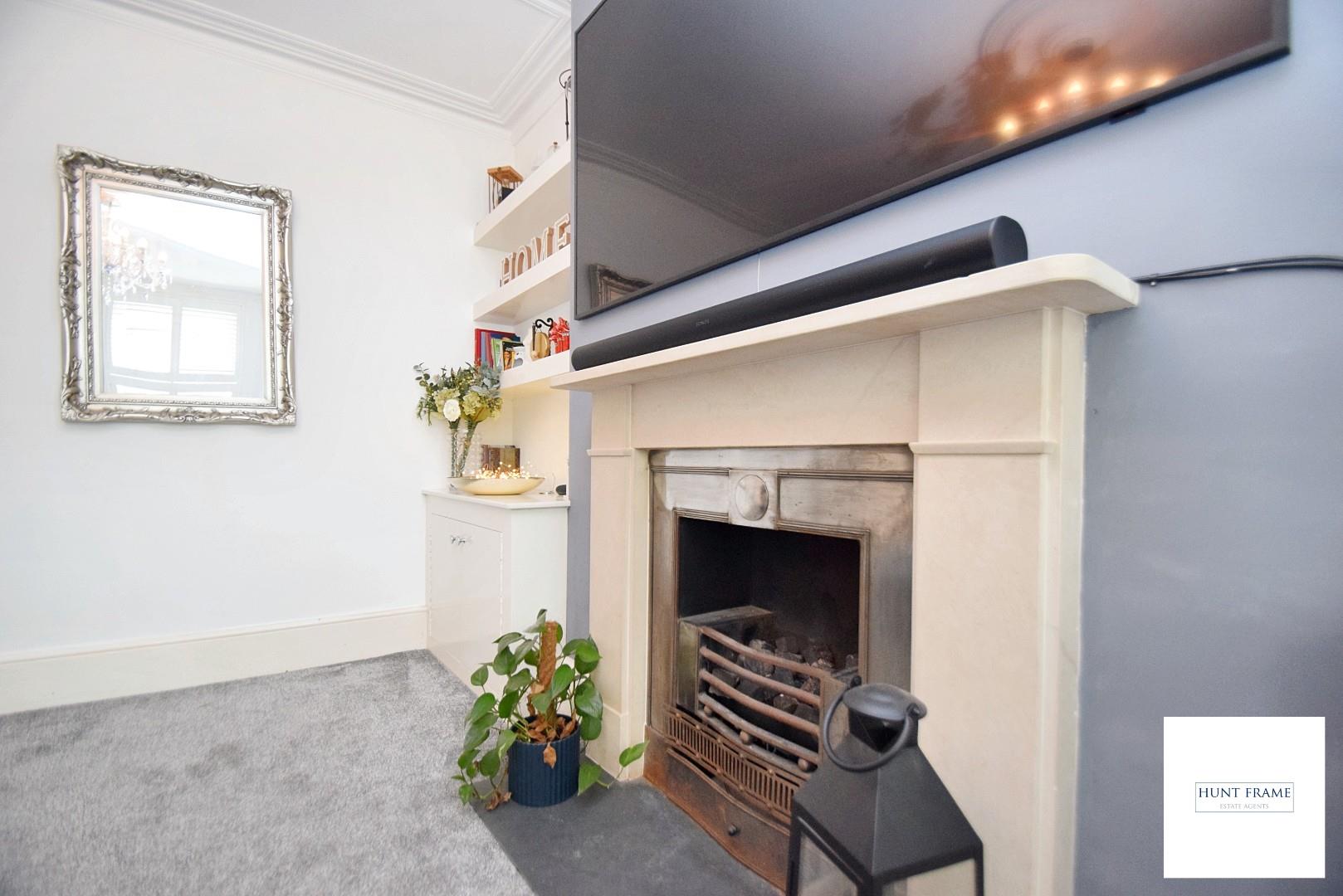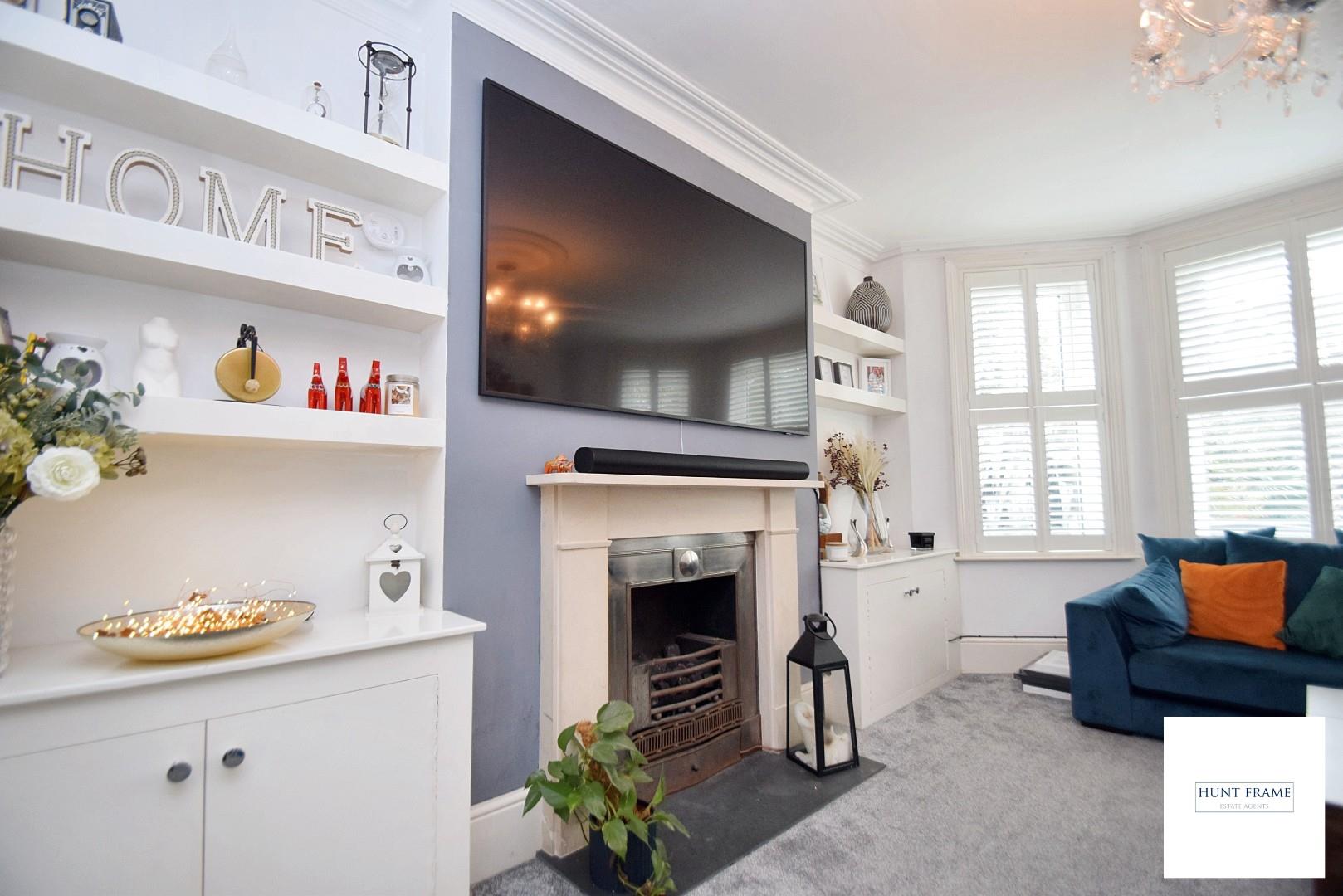 Radiator. Fireplace surround and mantle with an inset gas fire. Fitted shutters. Fitted storage cupboards and shelving, flanking the fireplace. Double glazed bay window to front aspect.