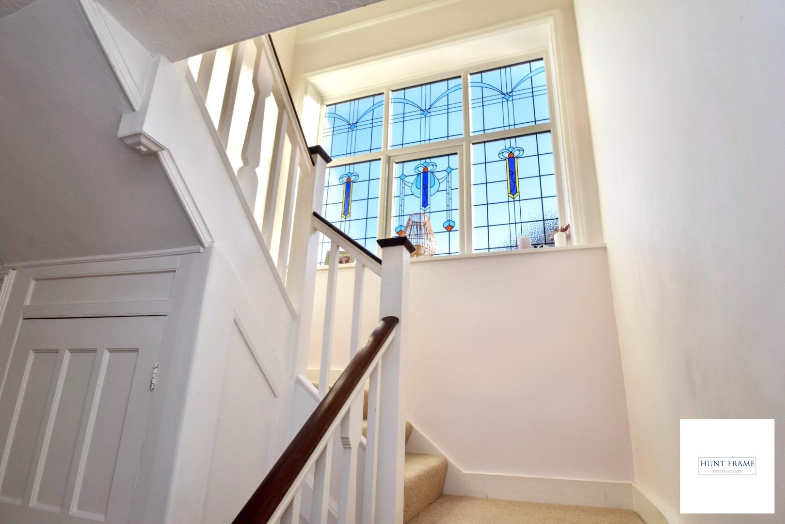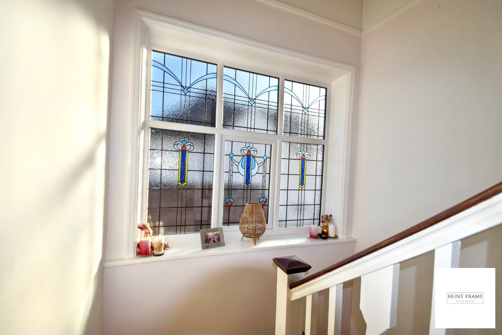 Period staircase rising to the first floor with a UPVC period style stained glass window to the side aspect, landing with loft access, fitted airing cupboard, radiator.