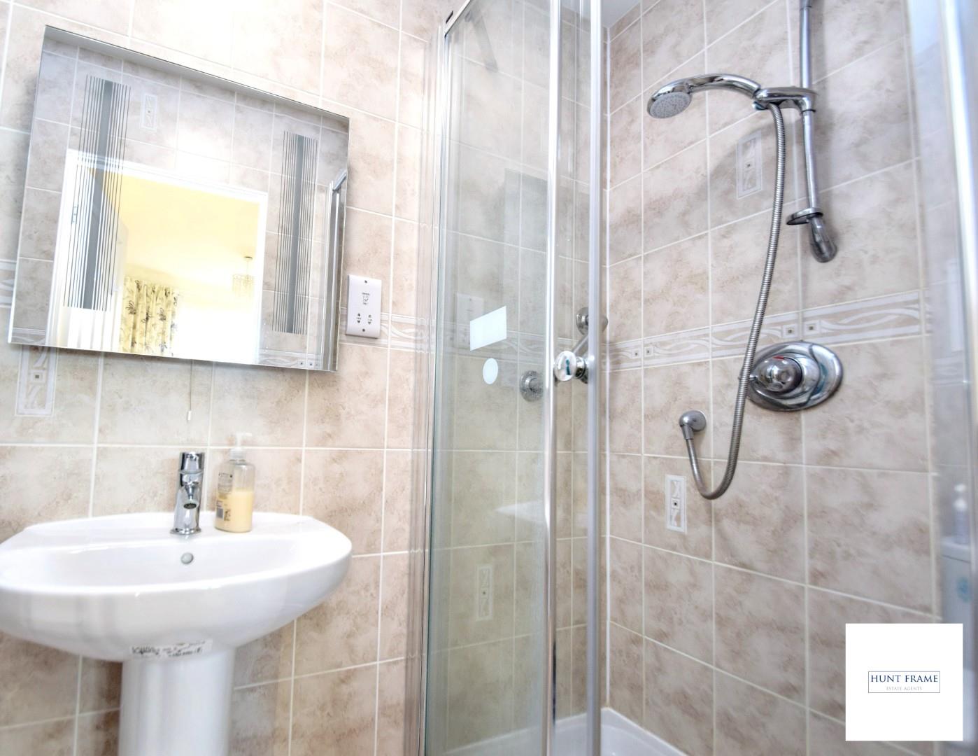Comprising of an enclosed shower cubicle with a shower unit and sliding door to the front, low level WC and wash hand basin, fully tiled walls, upright ladder style radiator.