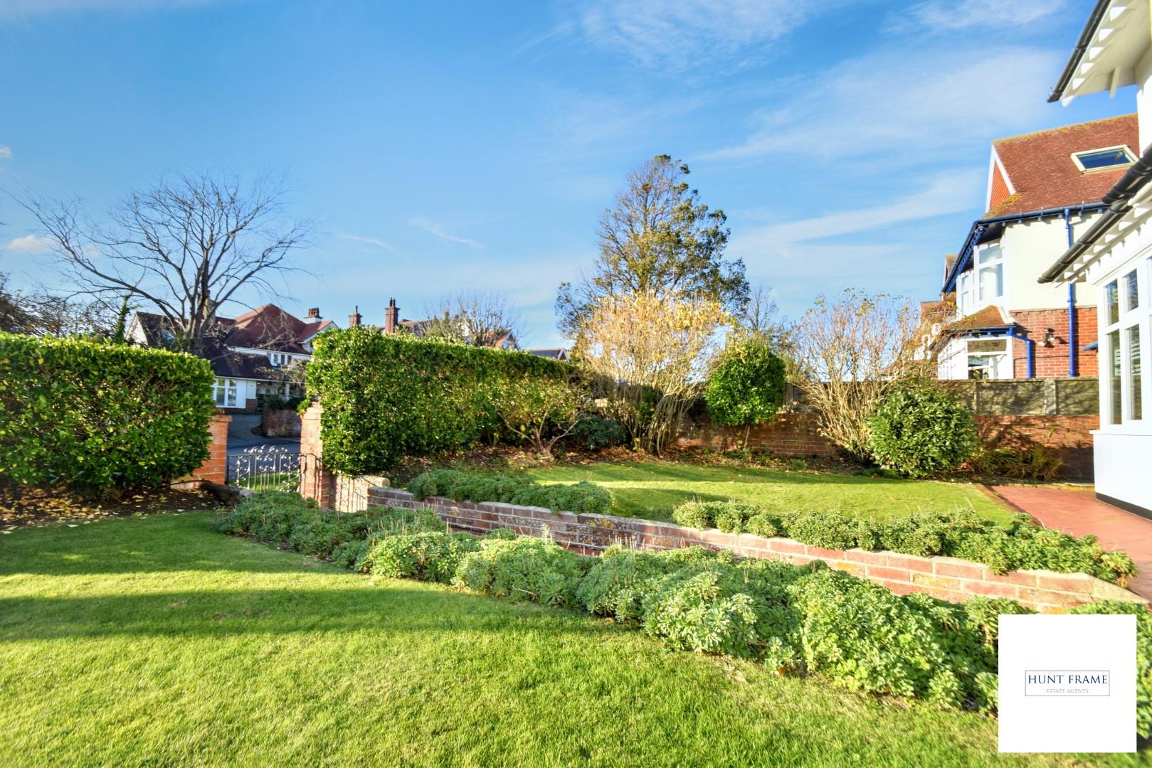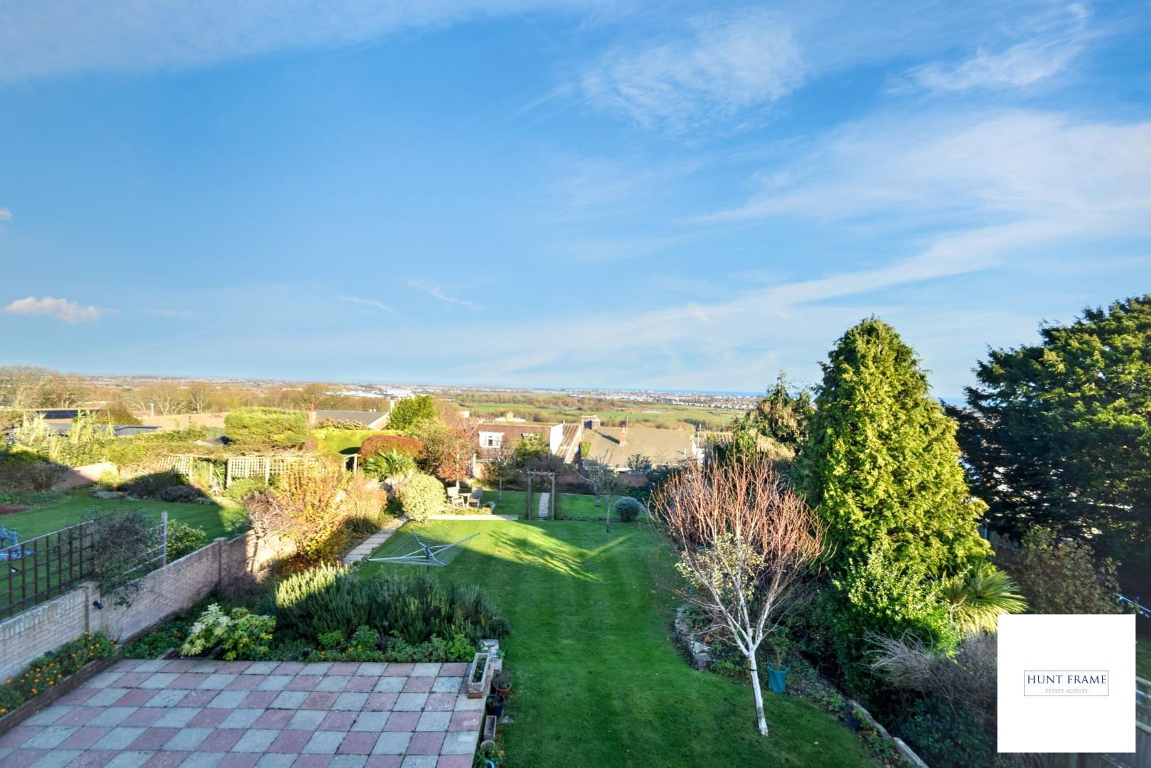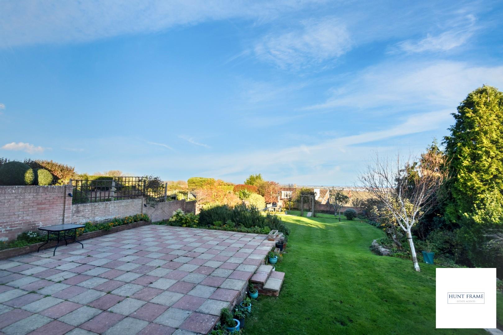 Extensive rear gardens with a large paved terrace which is adjacent to the dining room, the remainder is laid to lawn with established borders and seating areas with lovely, distant town and coastal views, gated side access, access to the detached garage.