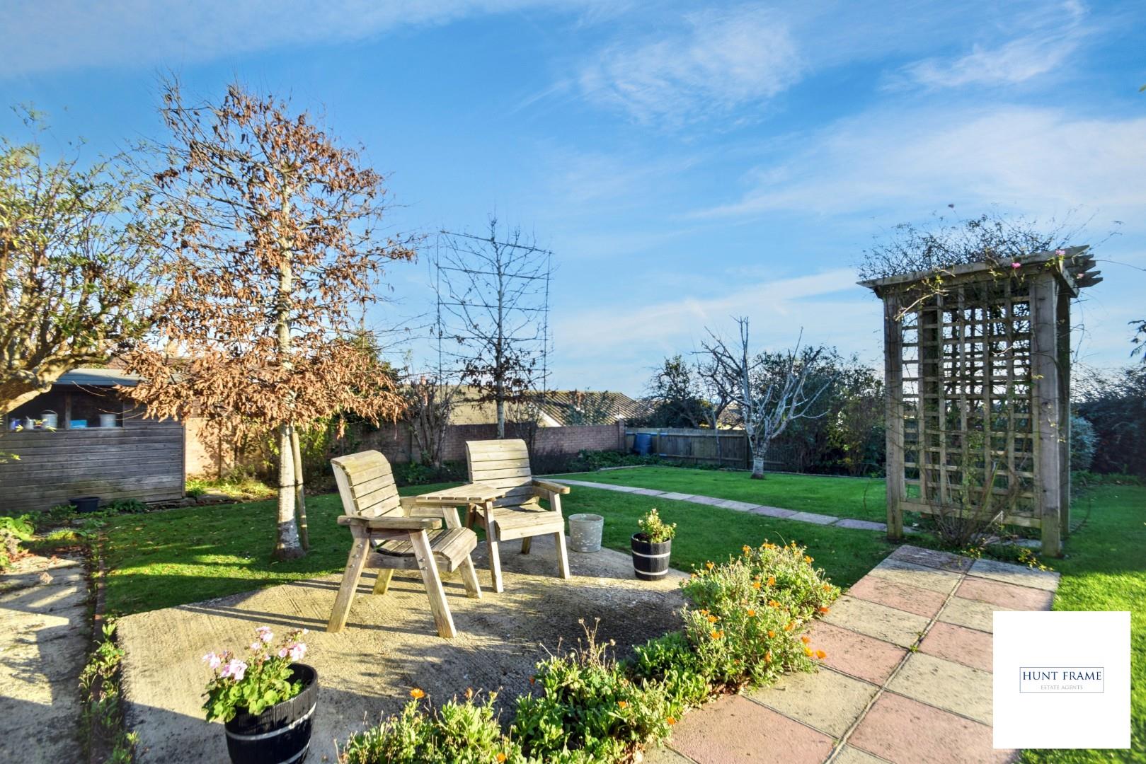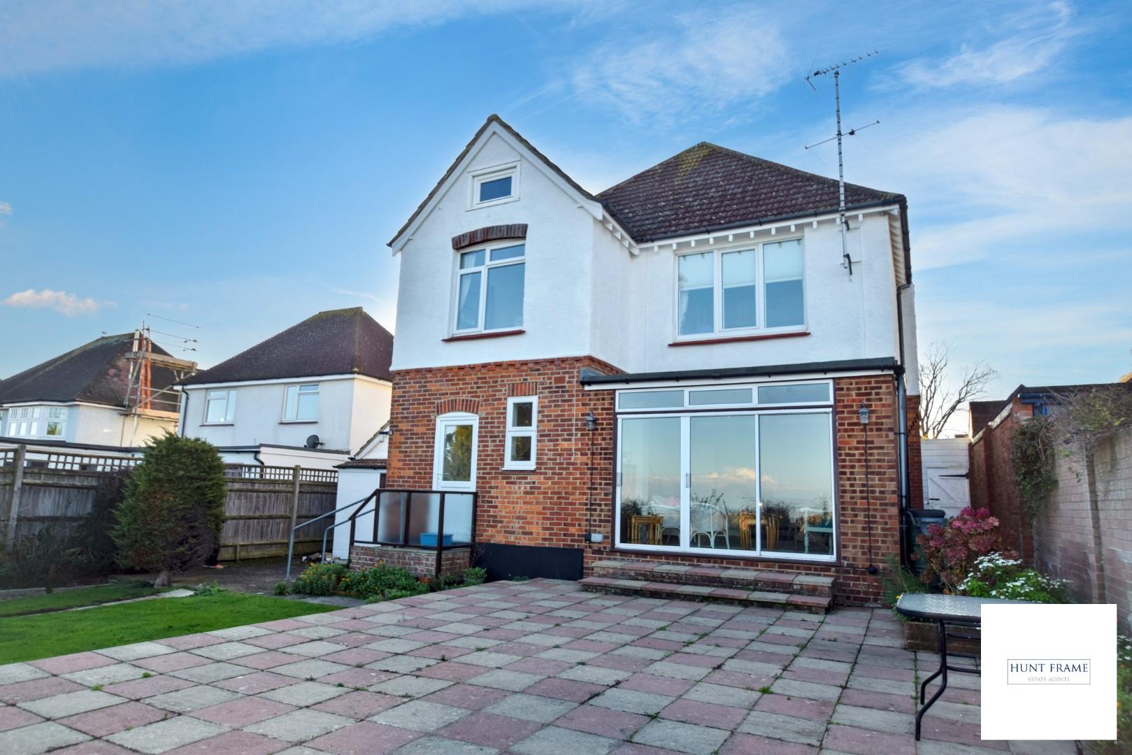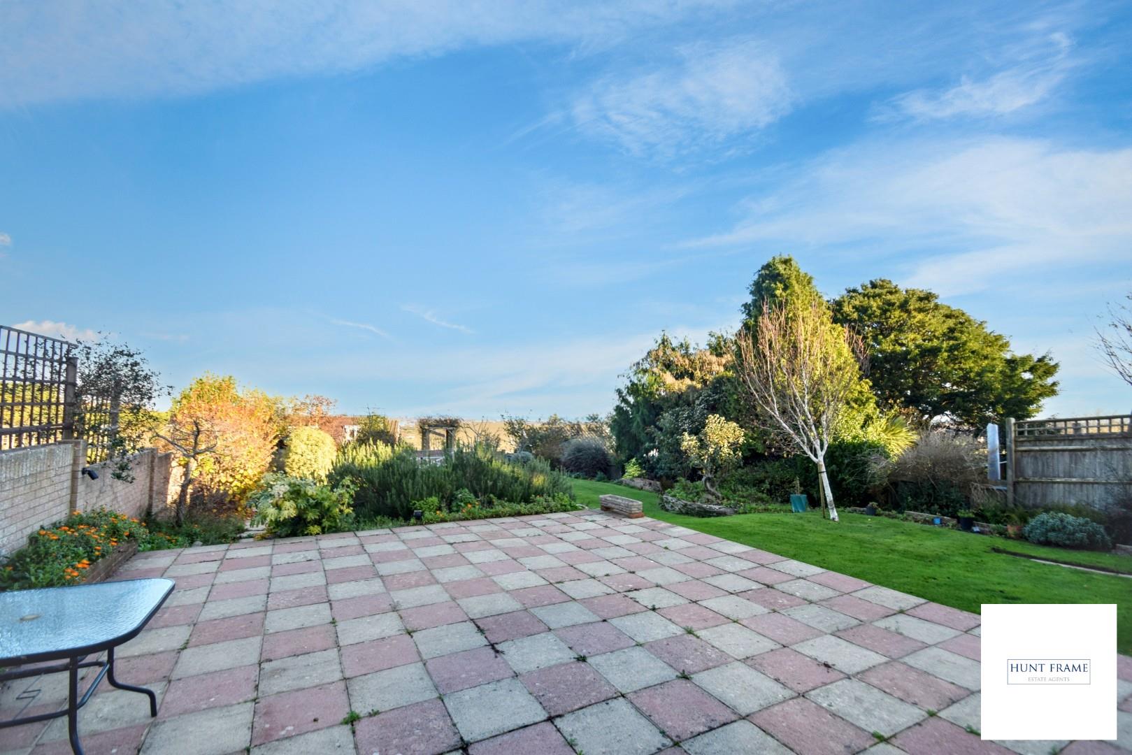 Extensive rear gardens with a large paved terrace which is adjacent to the dining room, the remainder is laid to lawn with established borders and seating areas with lovely, distant town and coastal views, gated side access, access to the detached garage.