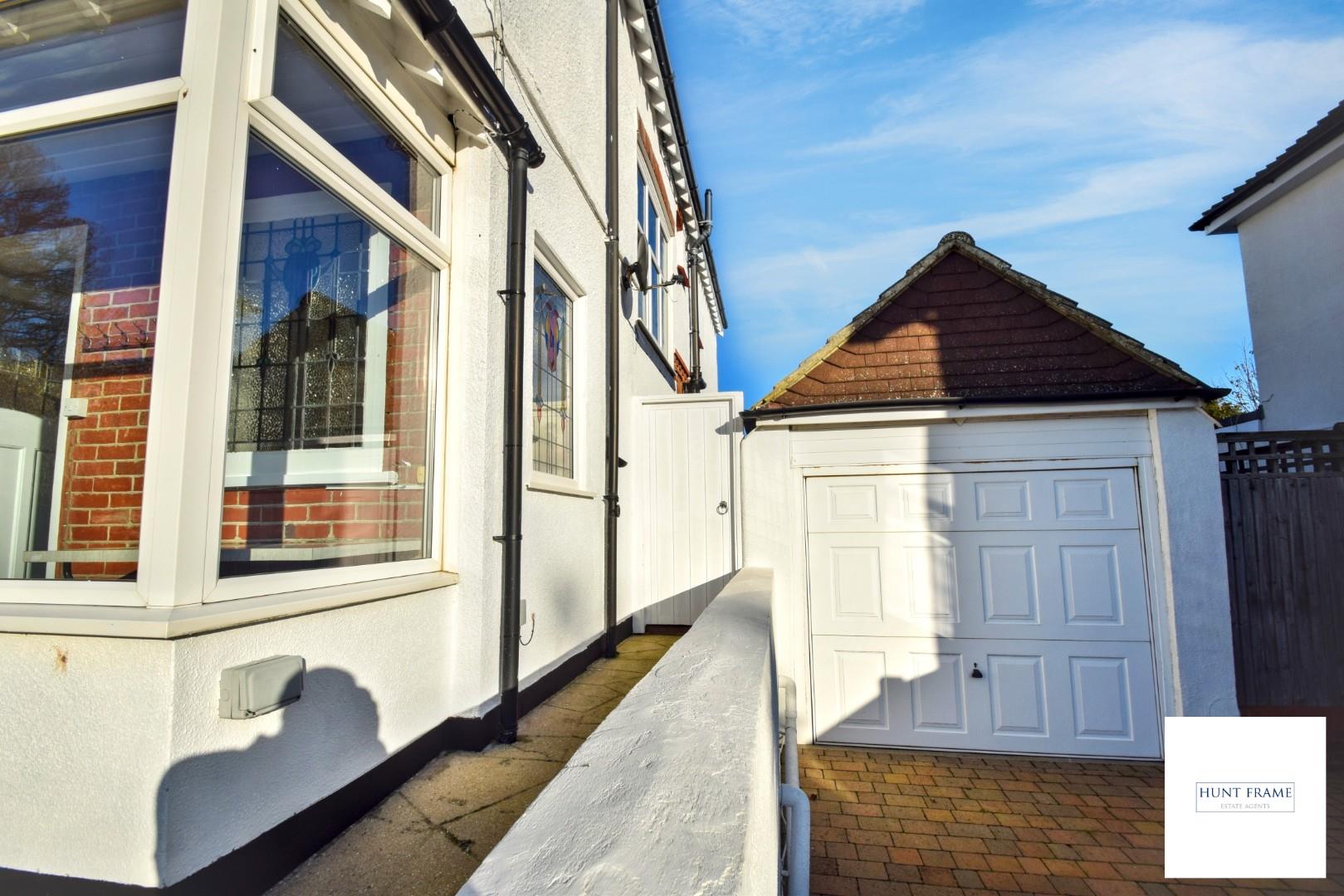Up and over door to the front with a small extension to the rear, power and light, personal door to the garden with driveway parking for approximately two vehicles.